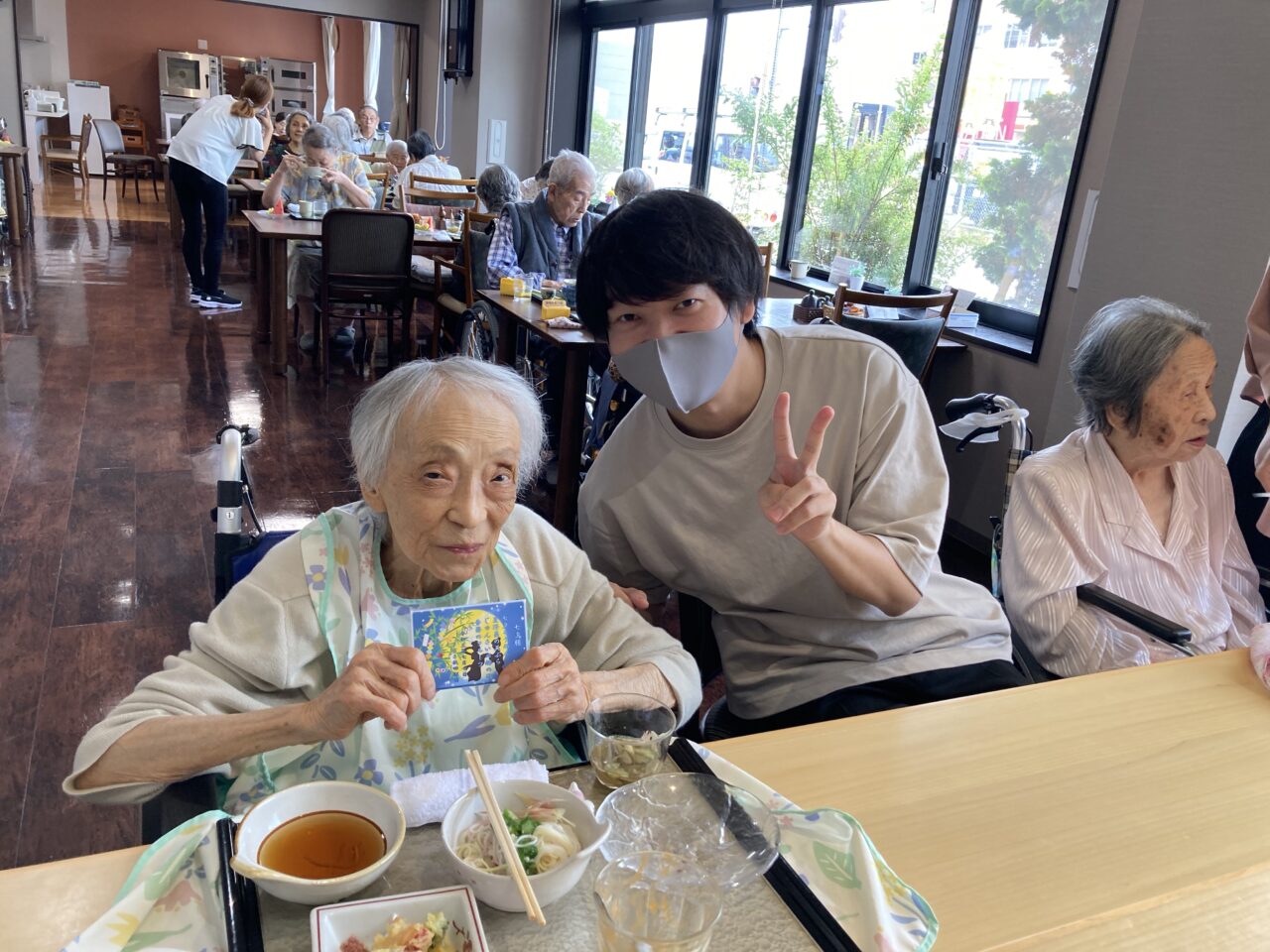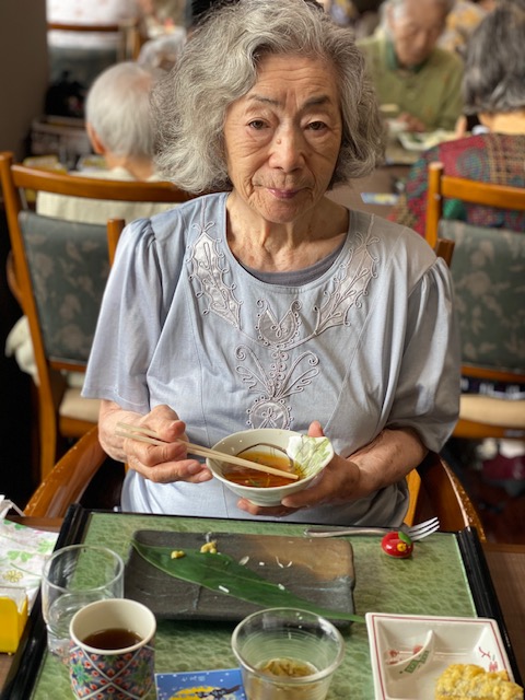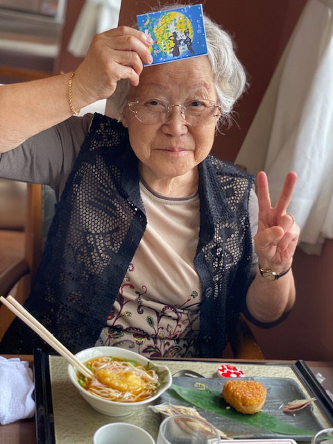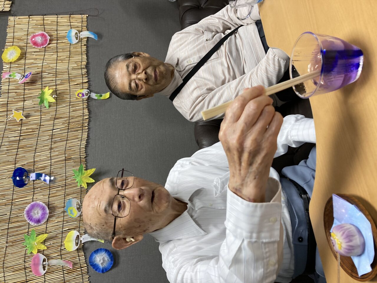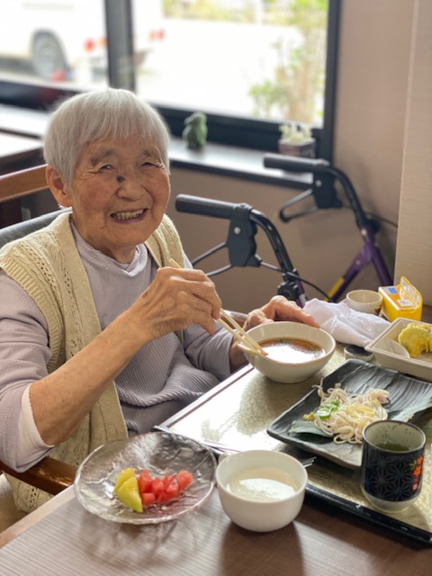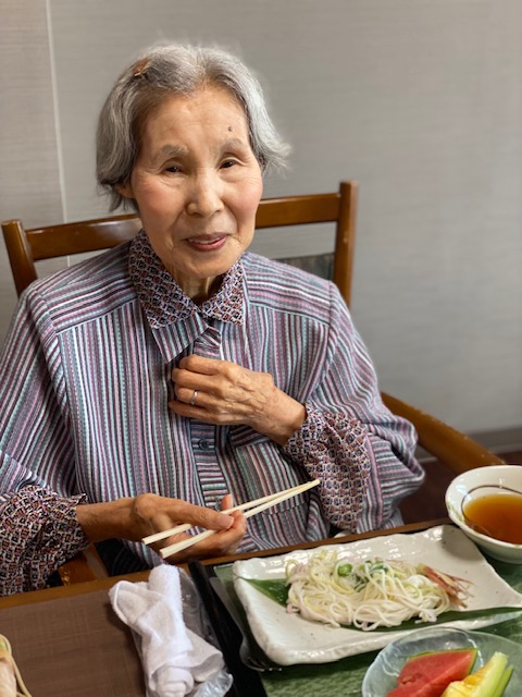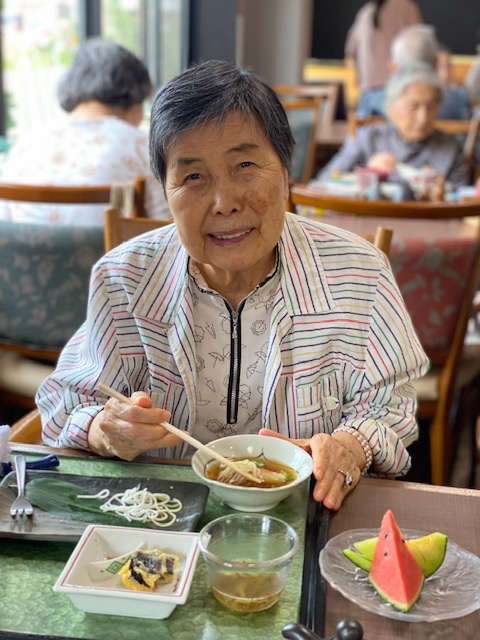 そんな日の昼食に七夕そうめんやサクサクの揚げたての天ぷら、じゅんさいとメロン&スイカと今日にピッタリのメニューで皆さん喜ばれていらっしゃいました☺?