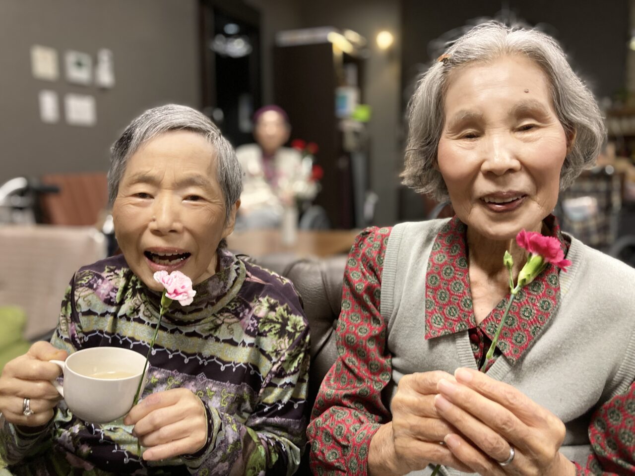 🌹華麗なカーネーションとの共演が笑顔を✨輝かせてますね。😊