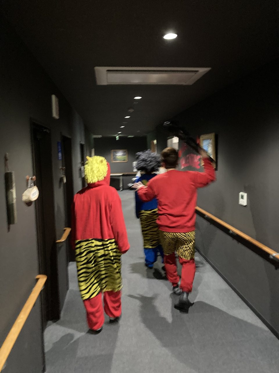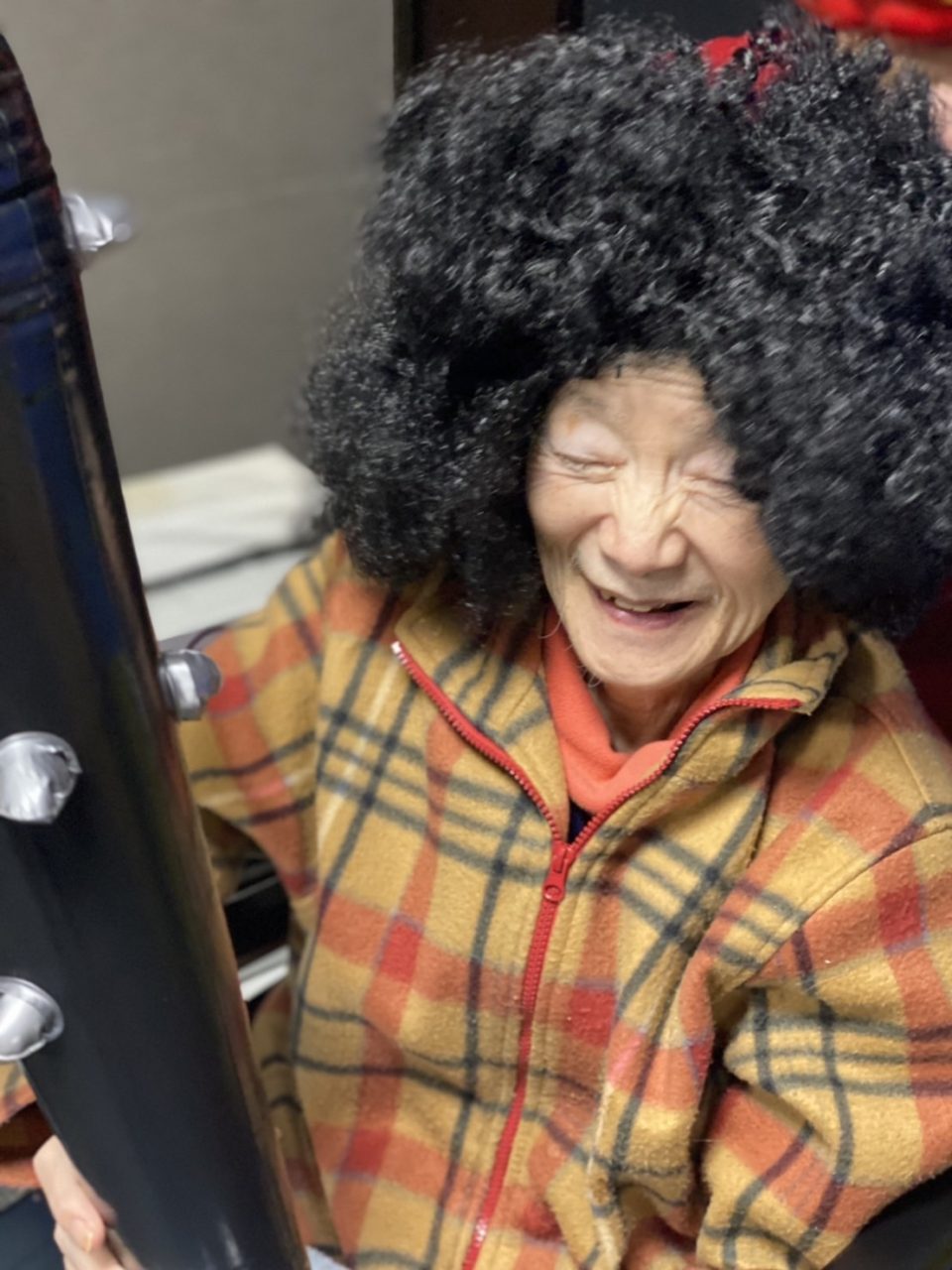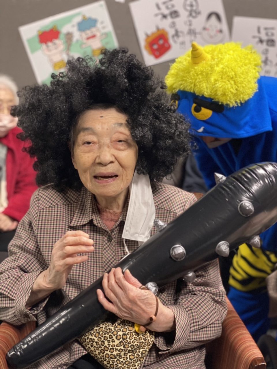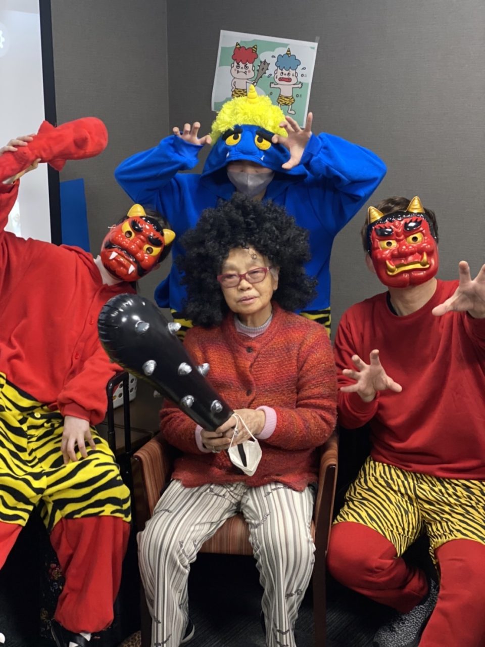 「アフロ貸して。」という声が聞こえて鬼に扮した利用者さん達?