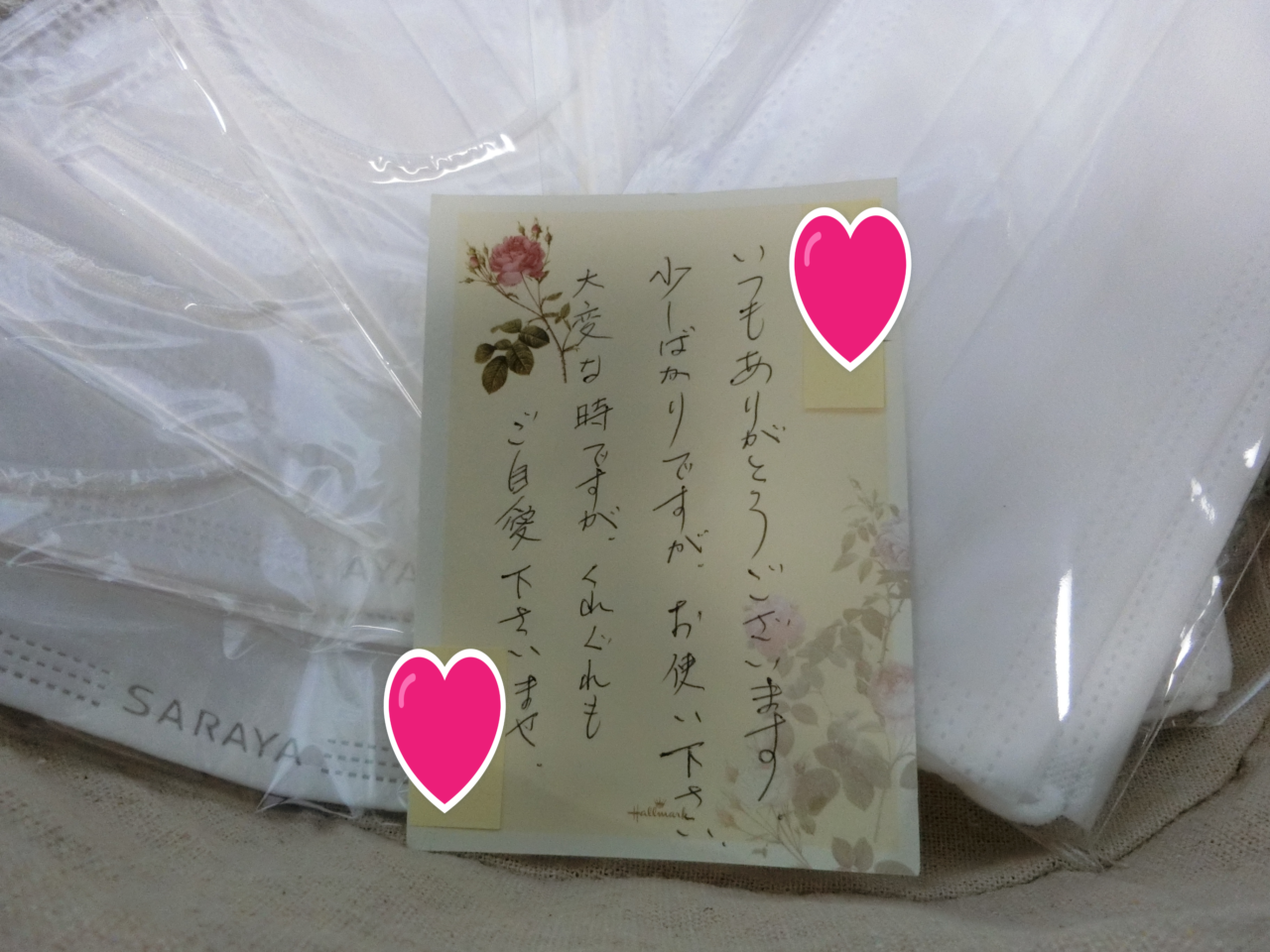 日本中どこを探してもマスク不足(+_+)、そして見つけても手が出ないほどの金額( 一一)に跳ね上がっている貴重なマスクが、ご利用者さんご家族から届きました?更に、心温まる、素敵な字で描かれた手紙?付きで?
