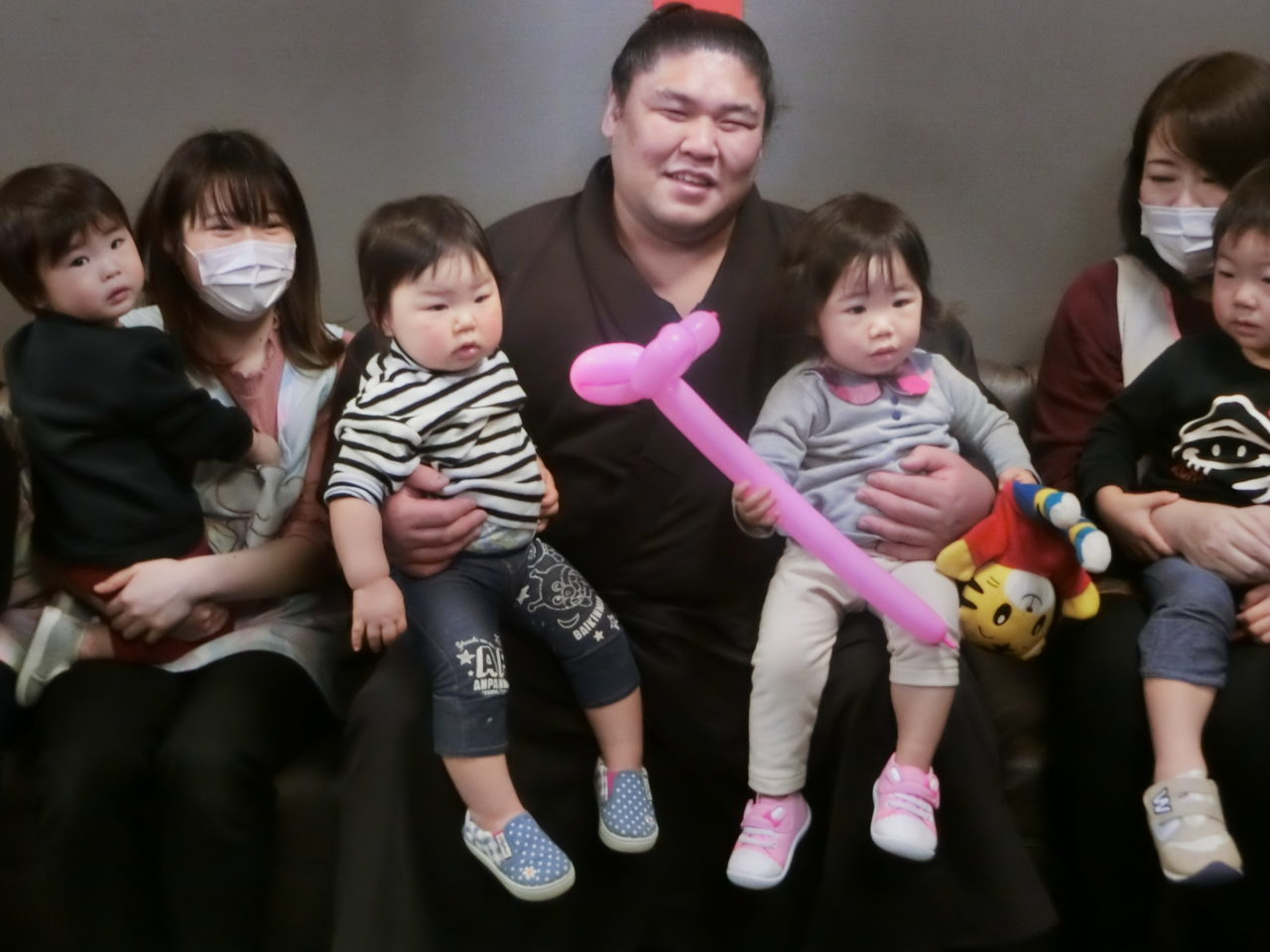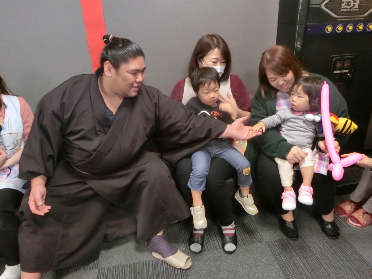 きらきら保育園の園児たちは、大きなお相撲さんに驚きながらも、ハイタッチ✋✨✋や握手で大喜び???