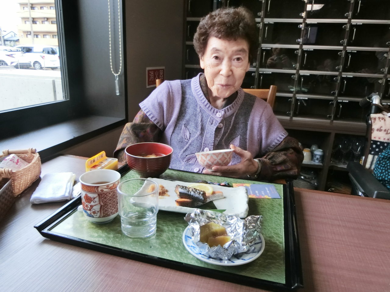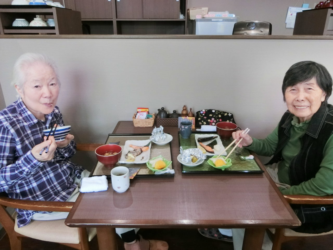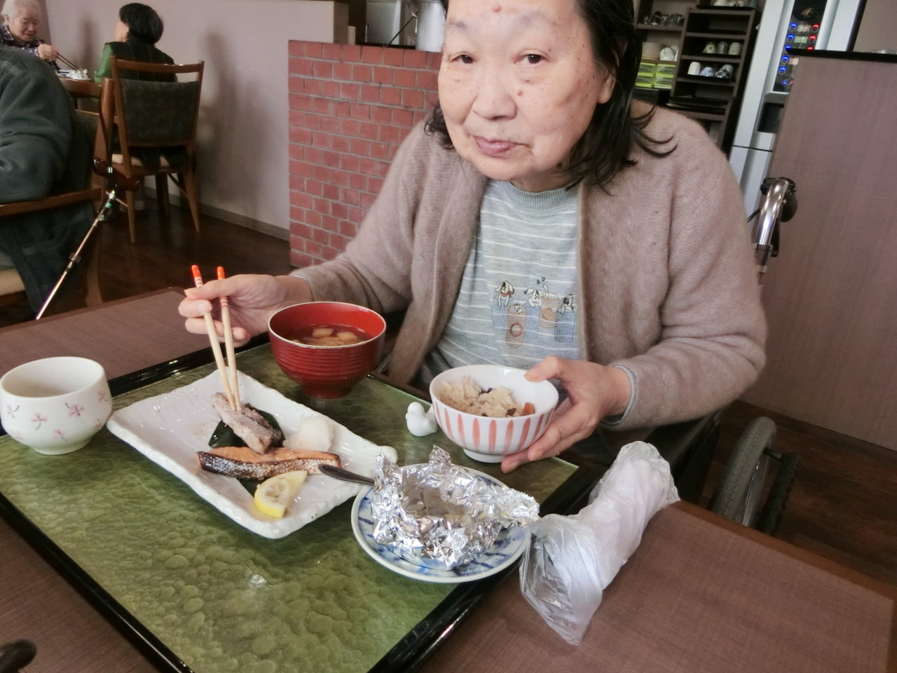 焼きたての魚をお膳へ運ぶと「まぁ~おいしそう。」「豪華だね!」と