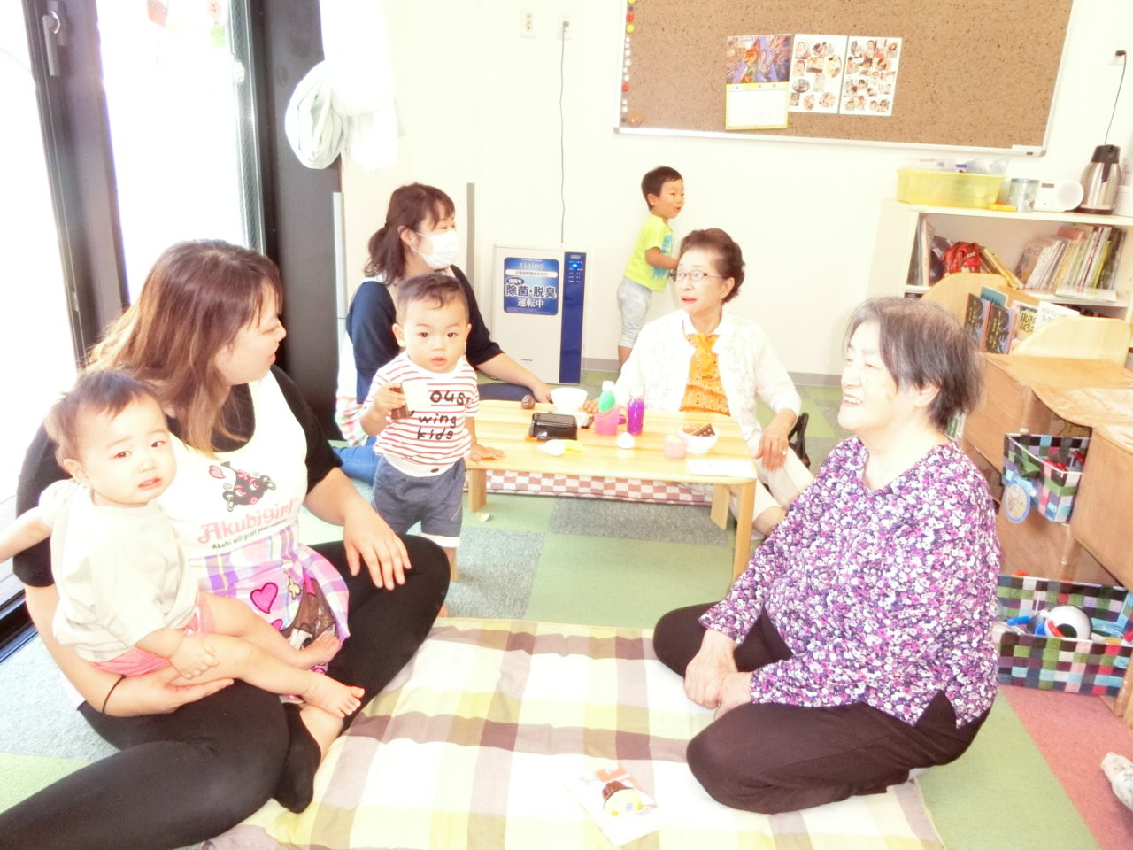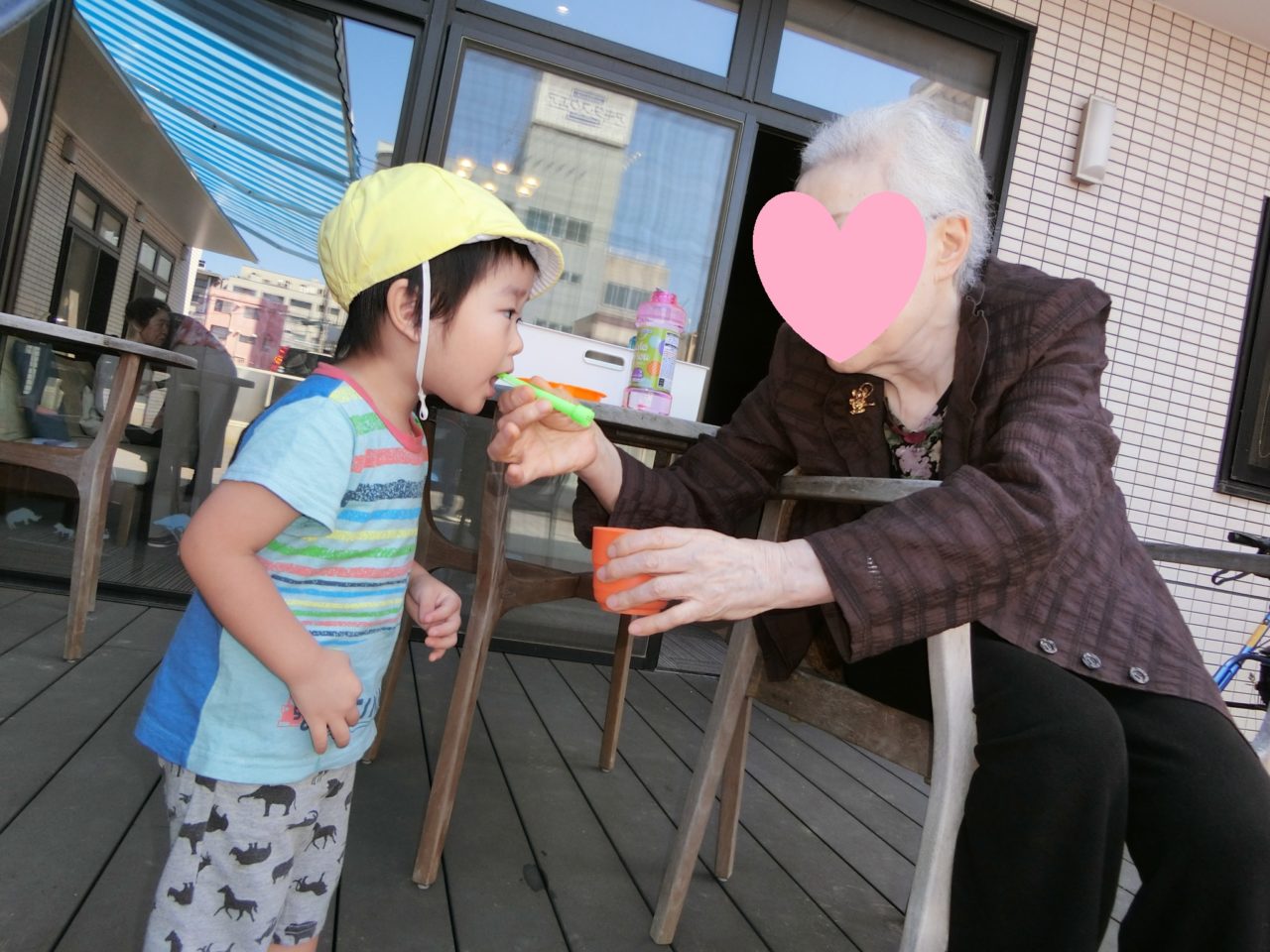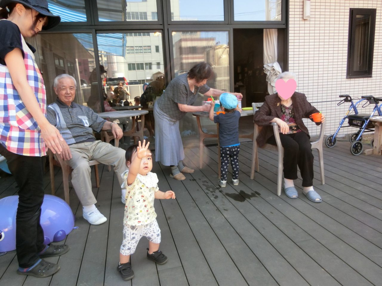 今日は保育園内、テラスで入居者さんと園児たちがいっしょに遊びました?