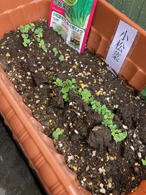 先日みなさんと一緒に植えた小松菜ですが芽が出てきました!!