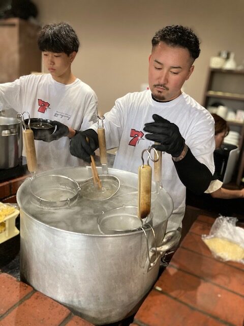 目の前で麺の湯切りをなかなか見れないので、みなさん釘付けでした?