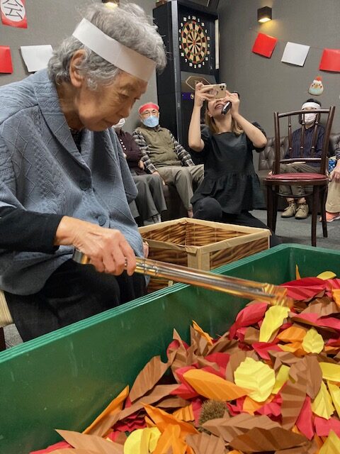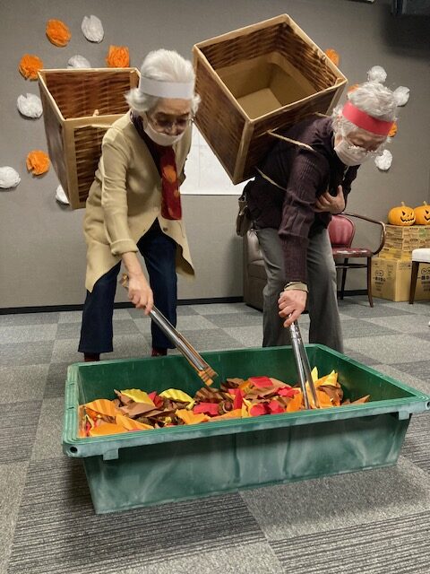 落ち葉に紛れた栗を掴んで、背負っているカゴに入れて行きます?