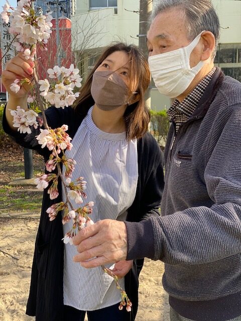 落ちている桜を手に取るNさんHさん🥰