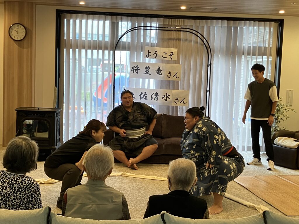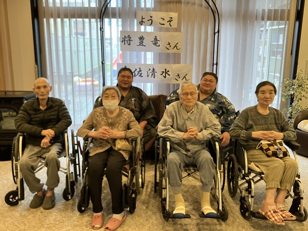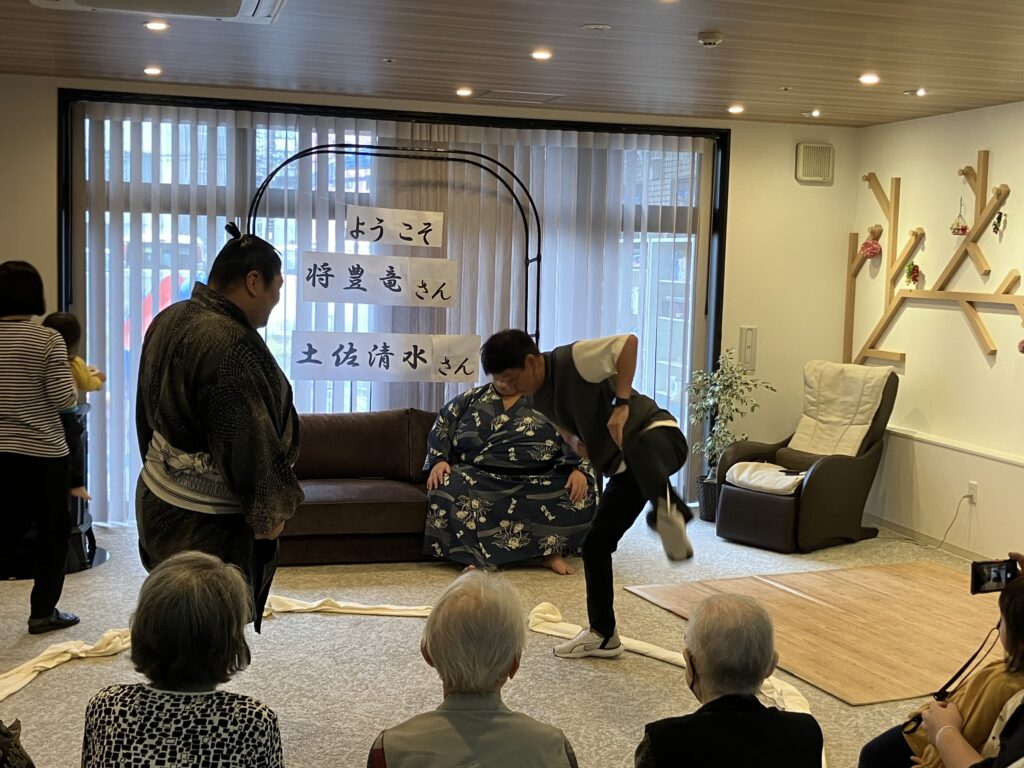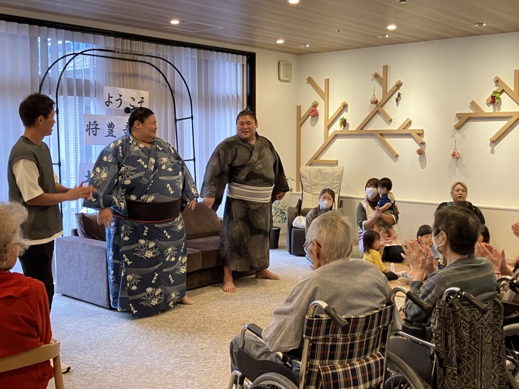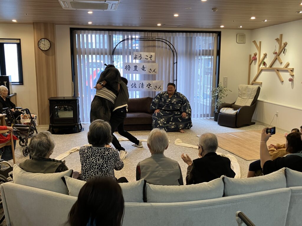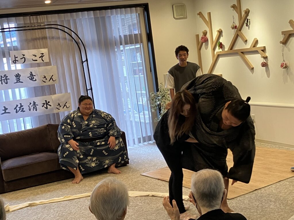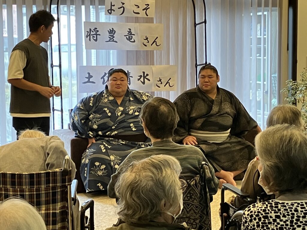 大きな力士のお二人を前にして、ちょっぴり緊張気味のご利用者さんもいらっしゃいましたが、