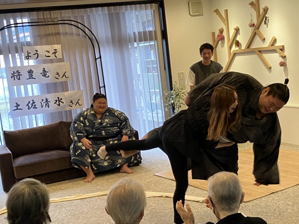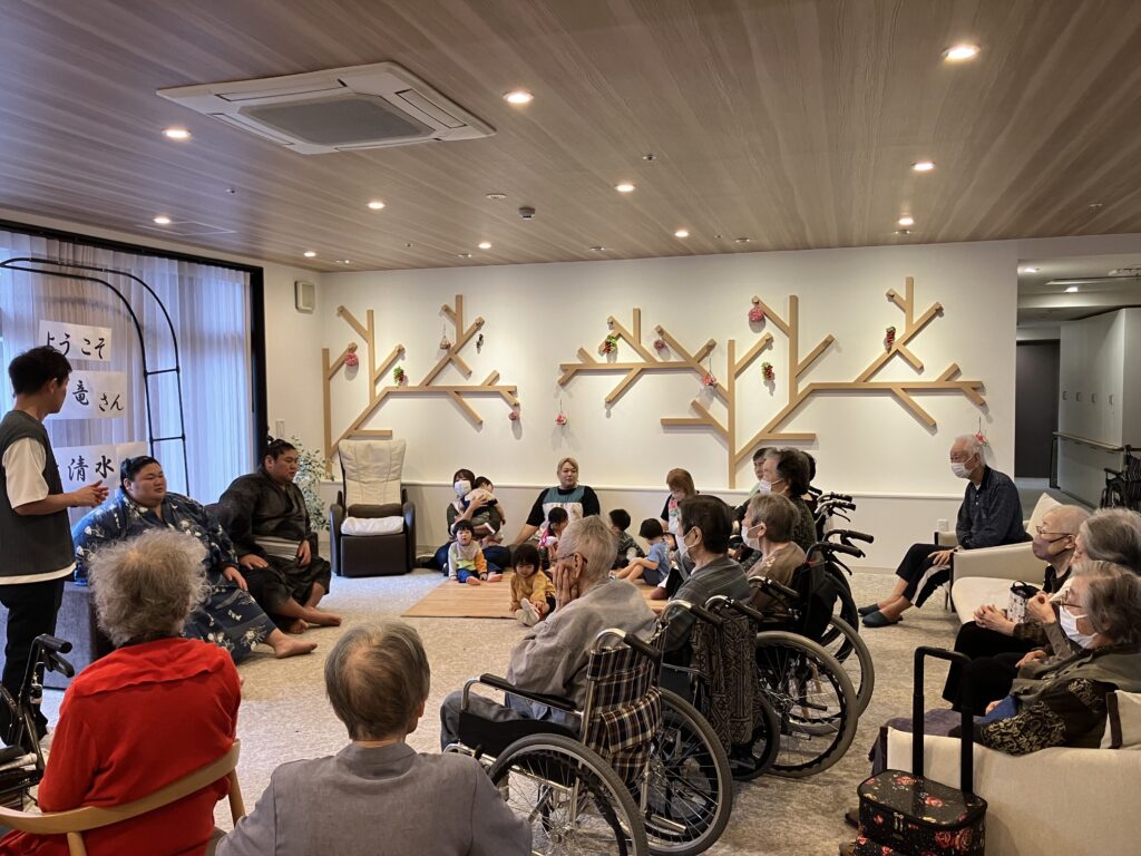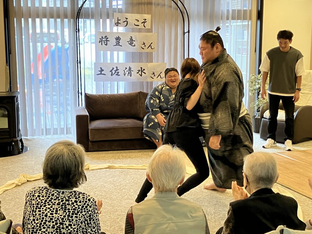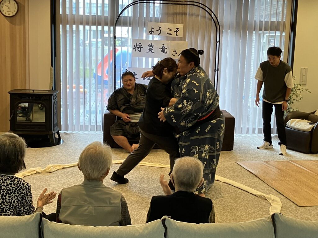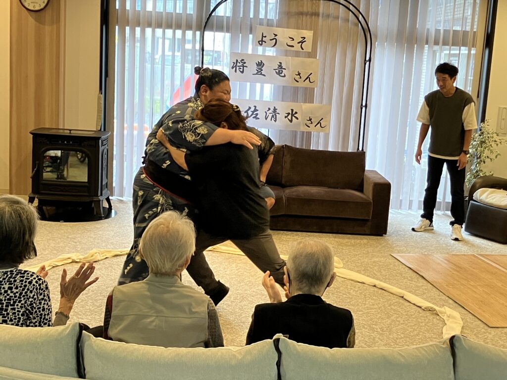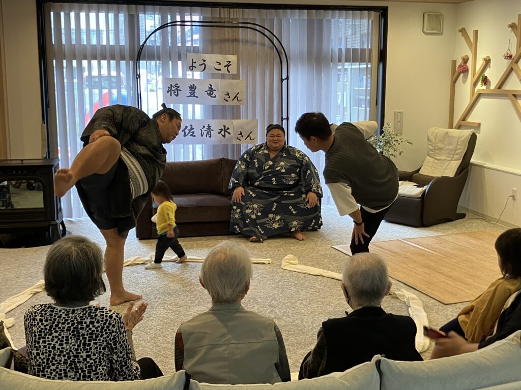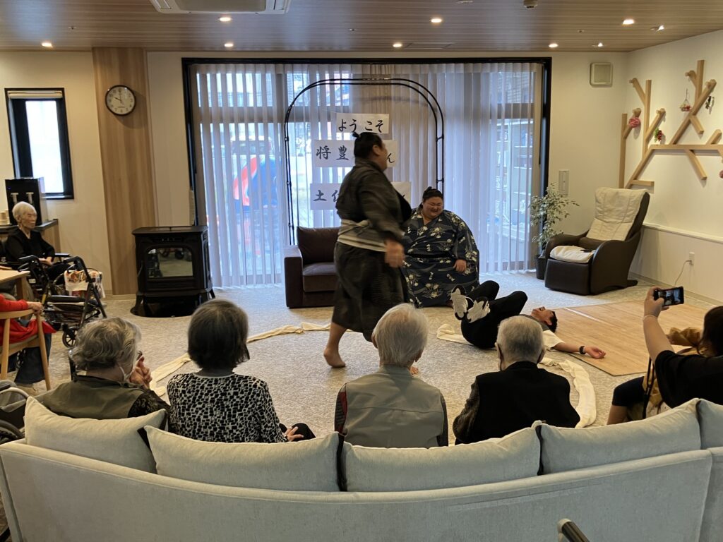 大きな力士のお二人を前にして、ちょっぴり緊張気味のご利用者さんもいらっしゃいましたが、