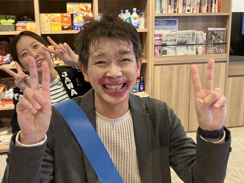 青のたすきをかけた健一施設長&優里パートナーのペア🚩