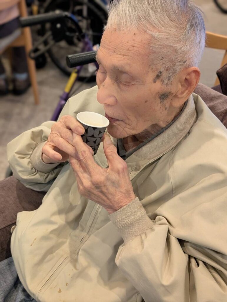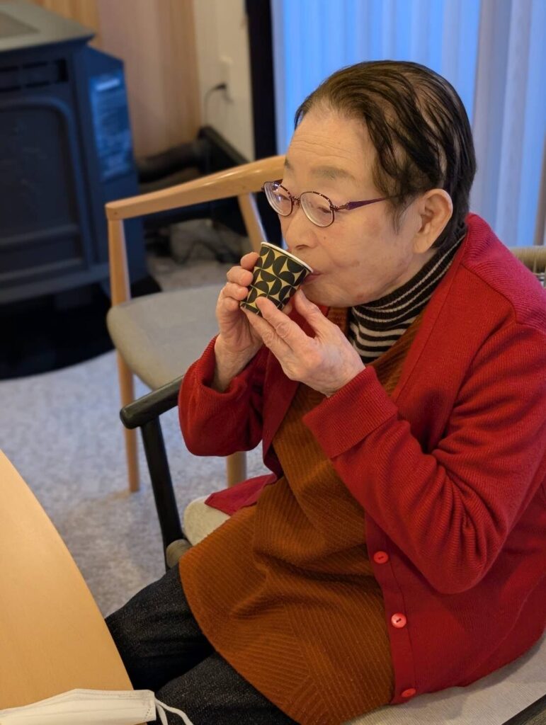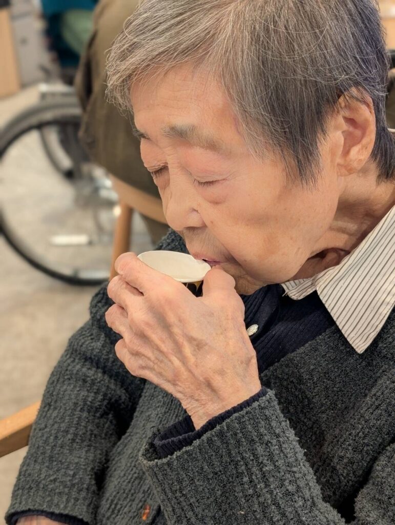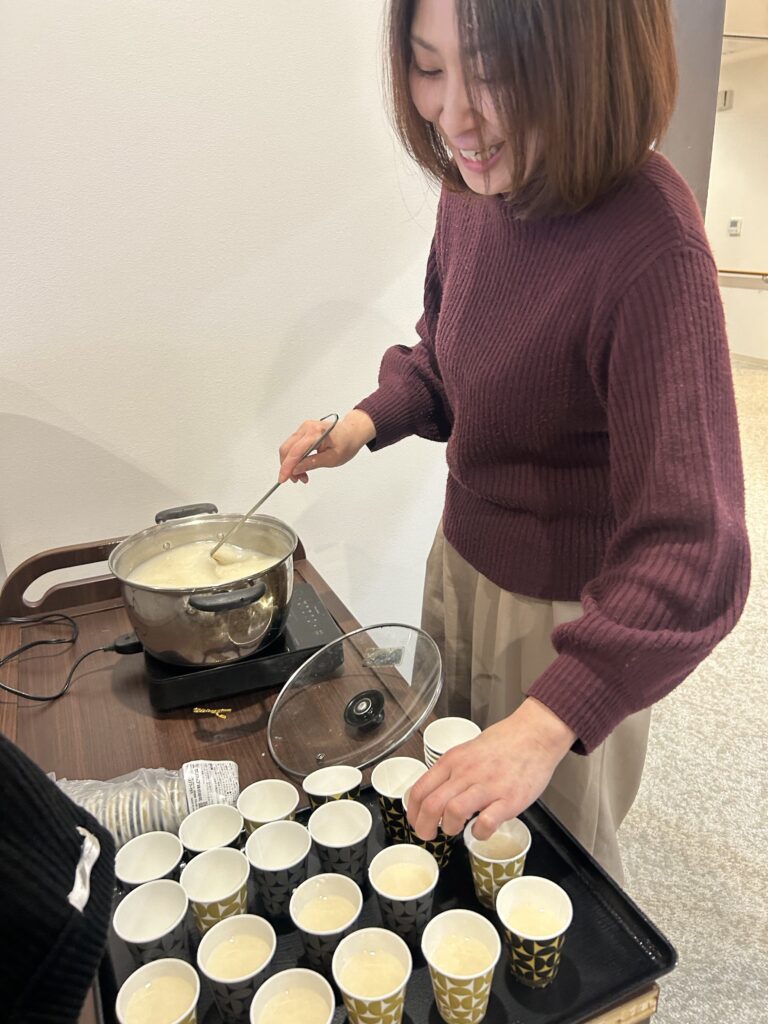福笑いを終えた後は熱々の甘酒を飲み、ホッと一息😮💨
