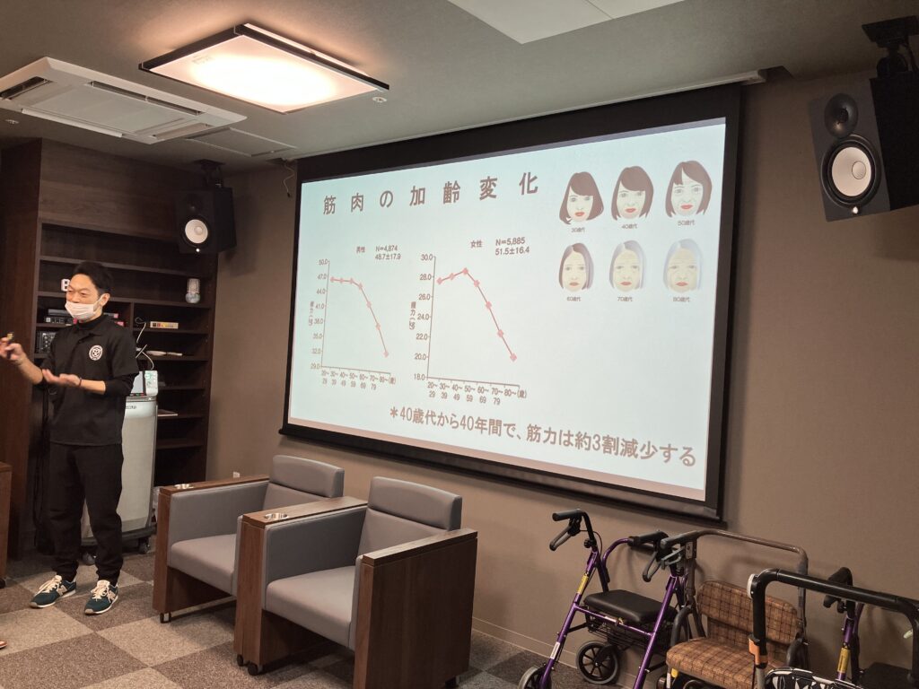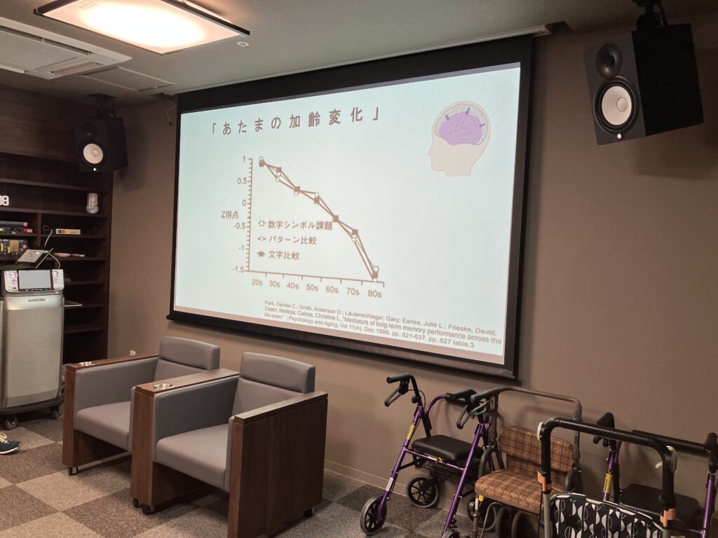 始めに、パワーポイントを使って人間の加齢変化について学びました。画像もあってわかりやすいです!