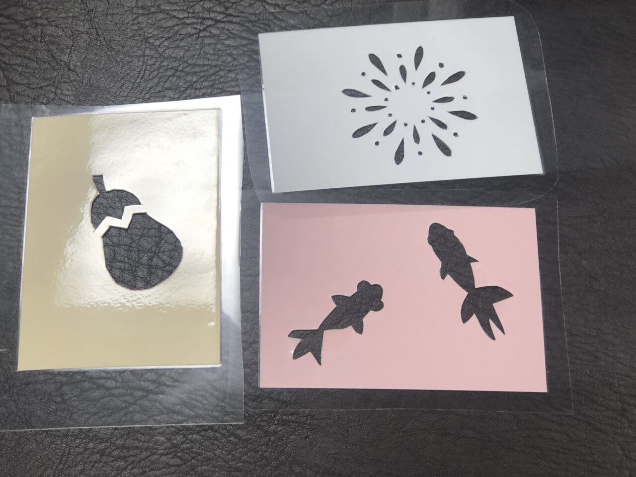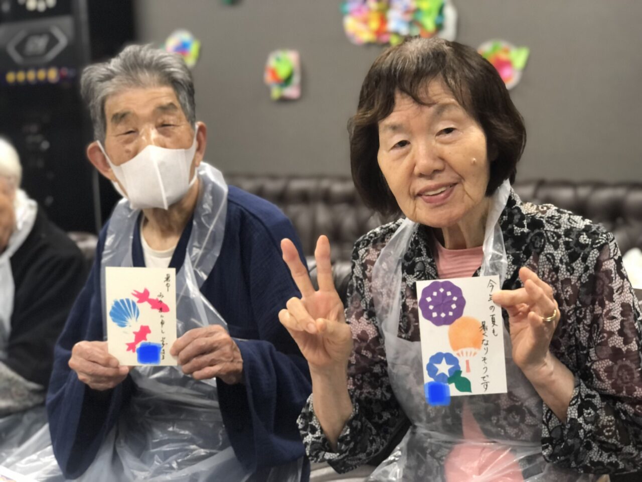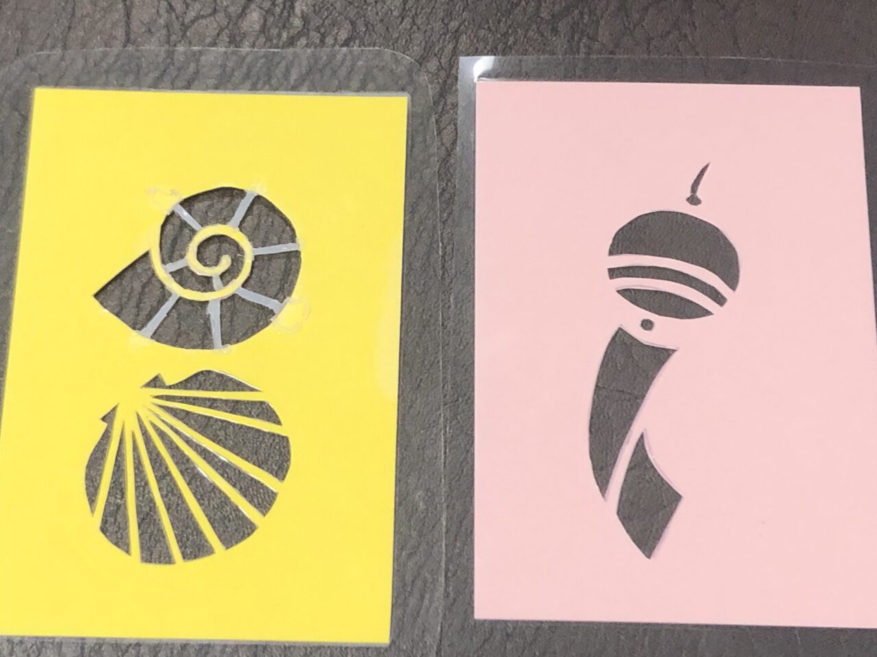 オリジナルの型紙をハガキに当てて、柔らかいスポンジでスタンプの様に押し当てていくもので、皆さんの個性が全開の作品が出来あがりました?