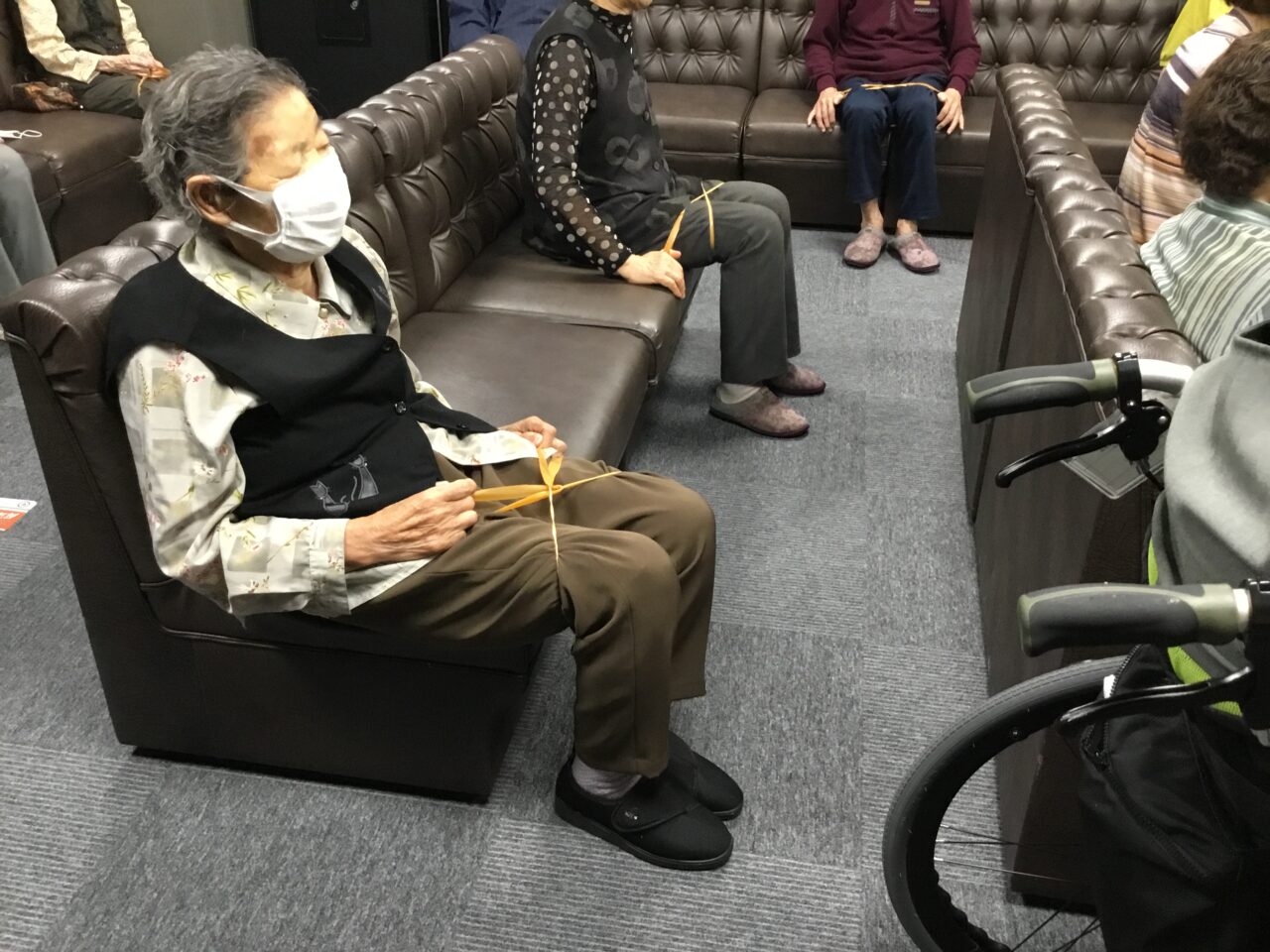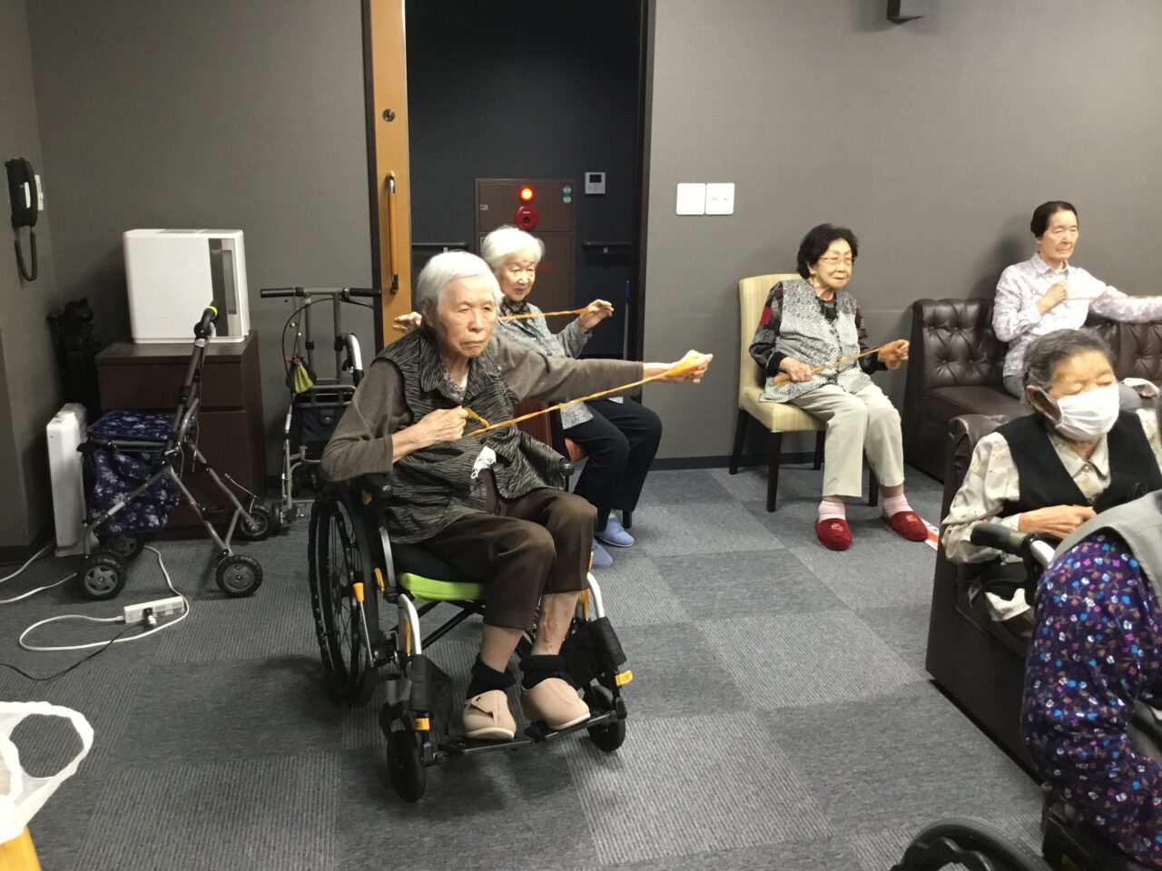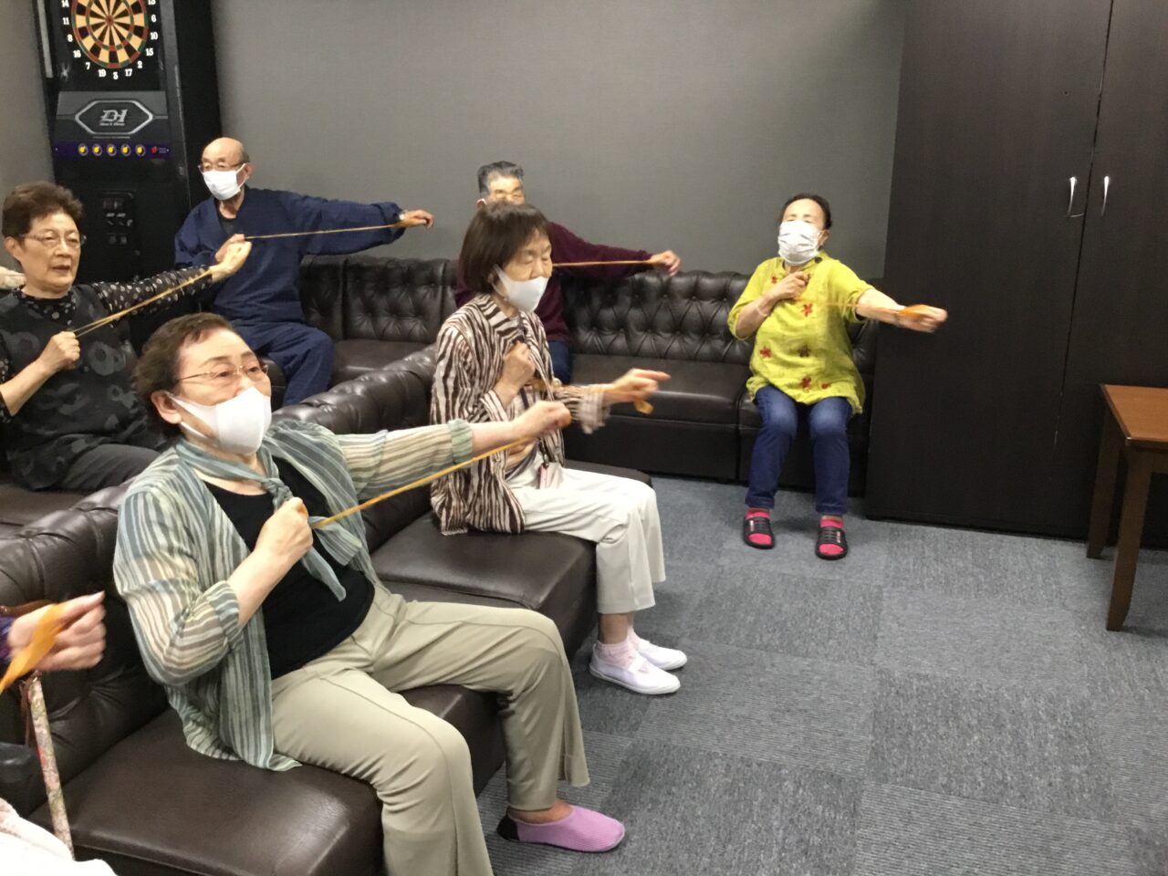 手に持って順番に伸ばす運動や、足に巻き付けて開いたり閉じたりと皆さん真剣に取り組まれています?‍♀️?‍♀️