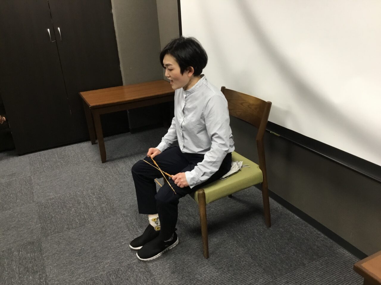 準備体操の後に、今日はゴムを使った体操を教えて頂きました?