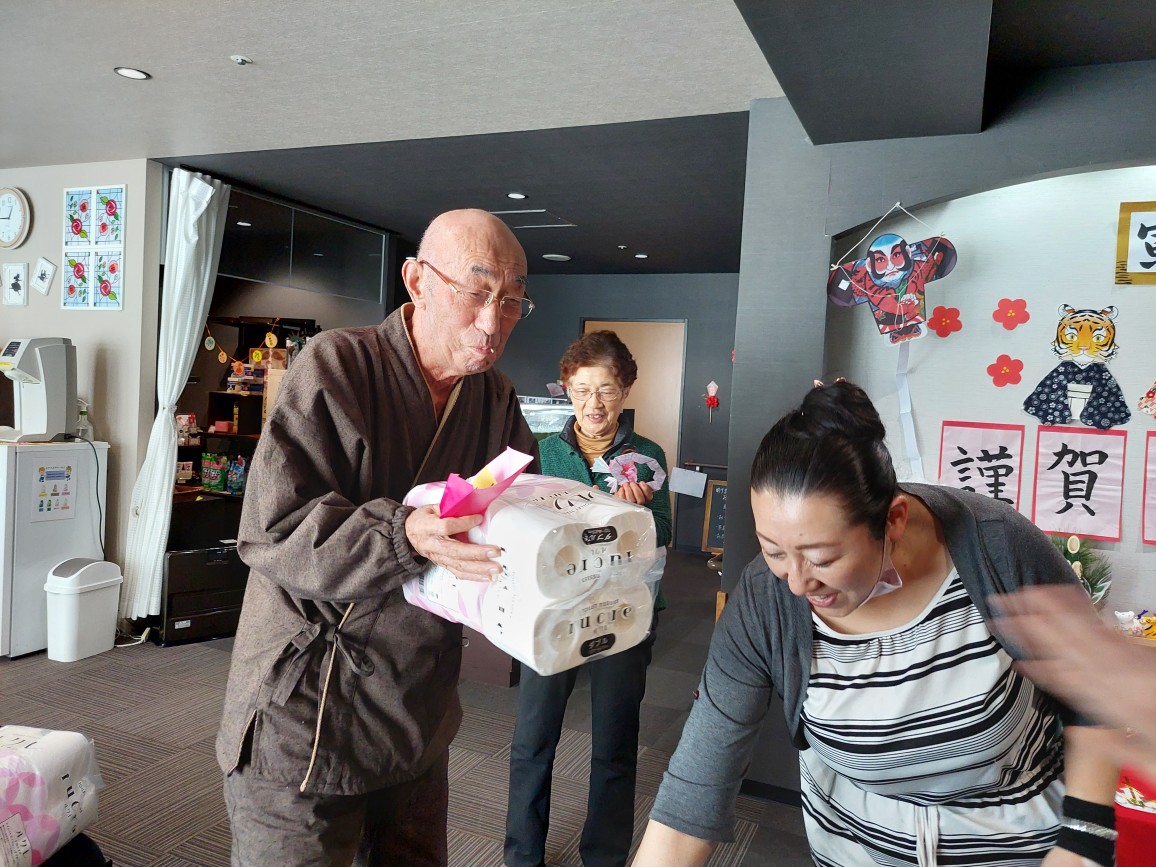 新年のご挨拶をしながら飾りや直子パートナー手作りのしめ縄を貰い年が明けたことを実感される利用者さん達でした?