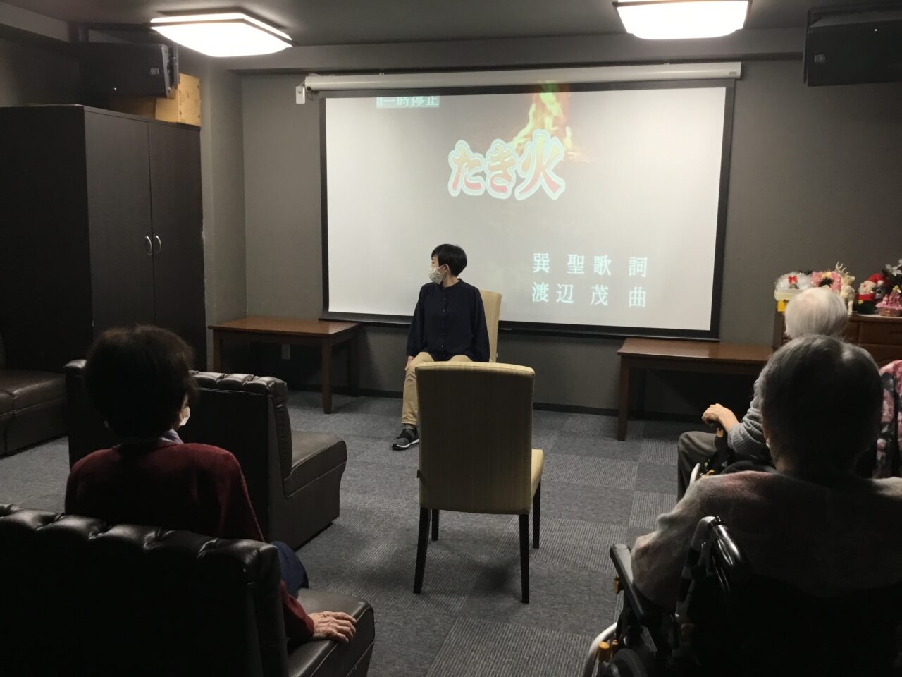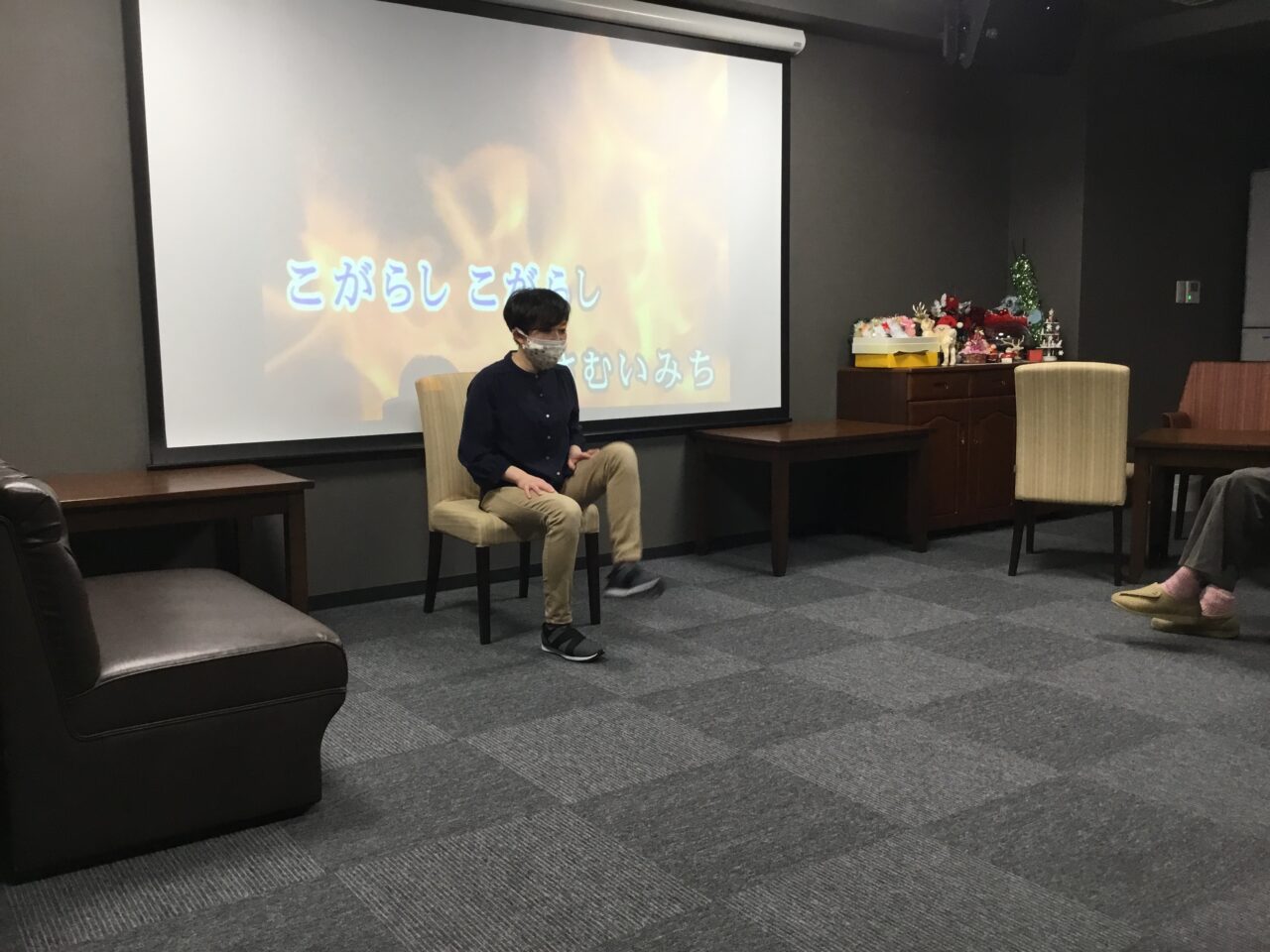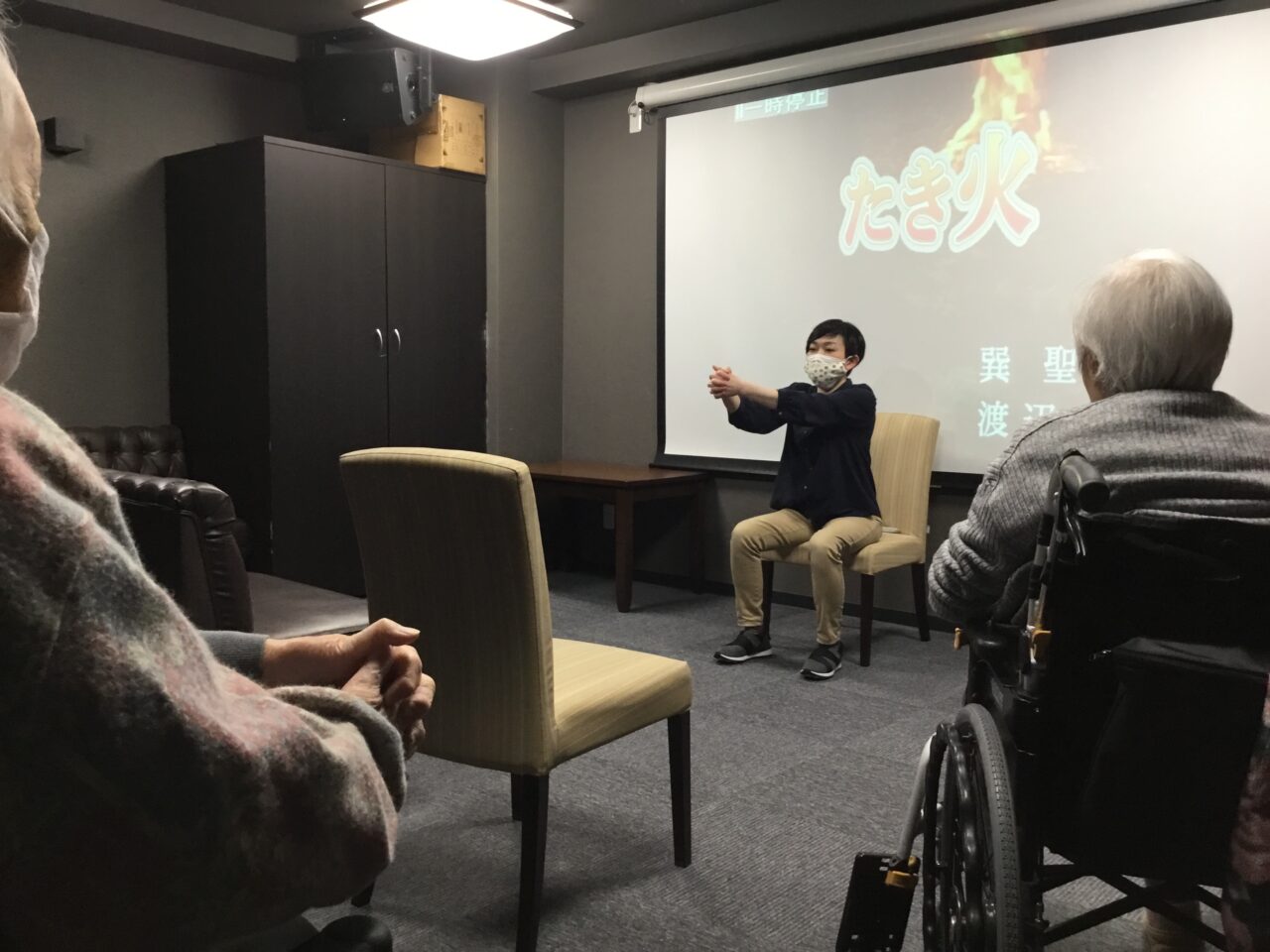 と、一通り基本体操を行った後は前回のおさらい、『たき火』に合わせて体操行います?