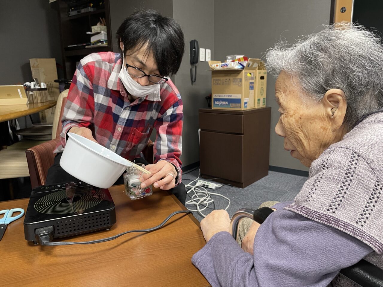 専用のジェルワックスを溶かして入れる様子を興味深々に見られる利用者さん達?