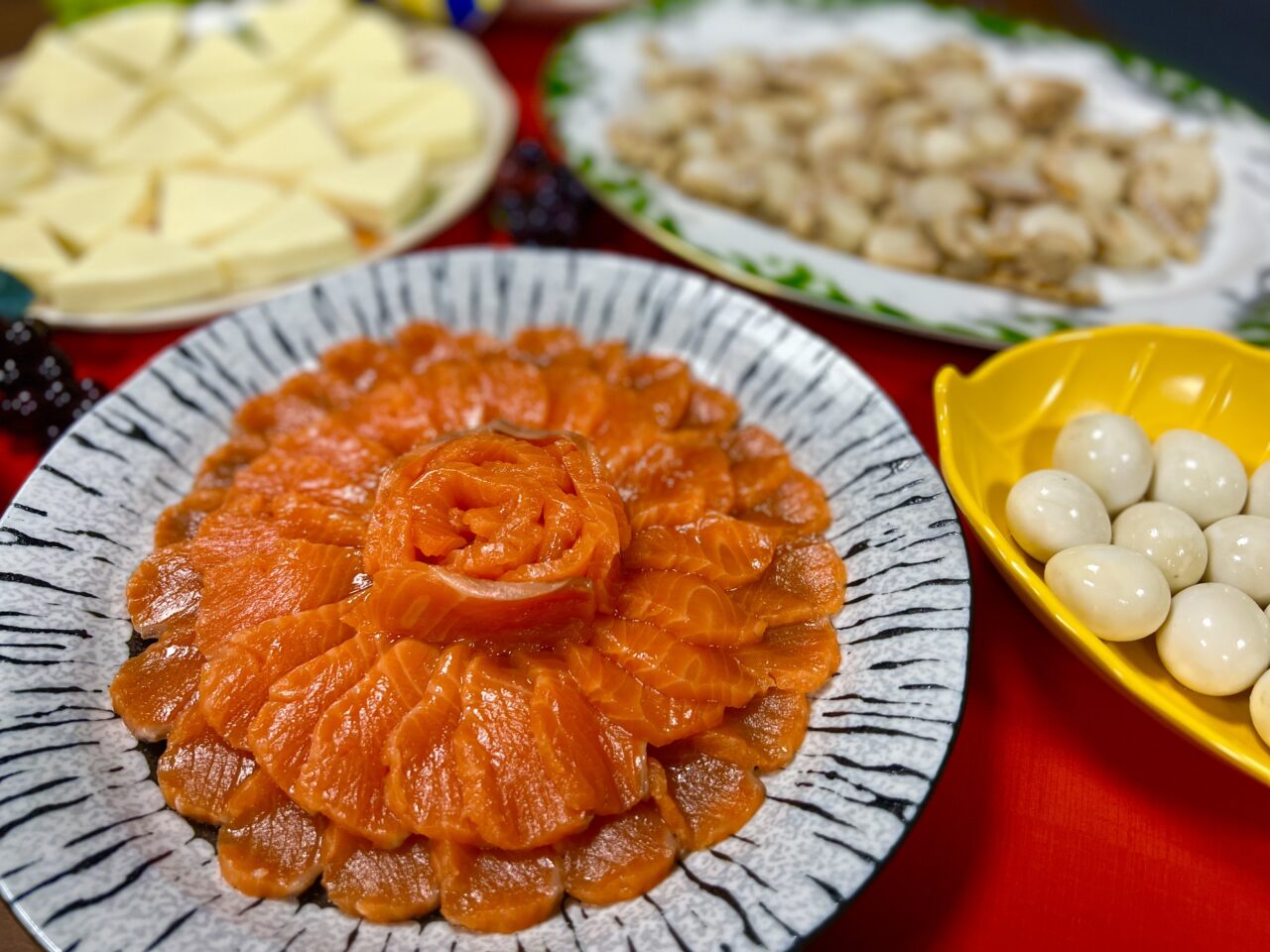 別館のスモークの達人‼️伊藤パートナーです?前回はチーズ?の燻製に挑戦してくださり今回はさらにグレードup?サーモンにホタテ、うずらの卵?、もちろんチーズ?もご用意✨変わり種でポテトチップスとバラエティーに富んだラインナップを準備させて頂きました。