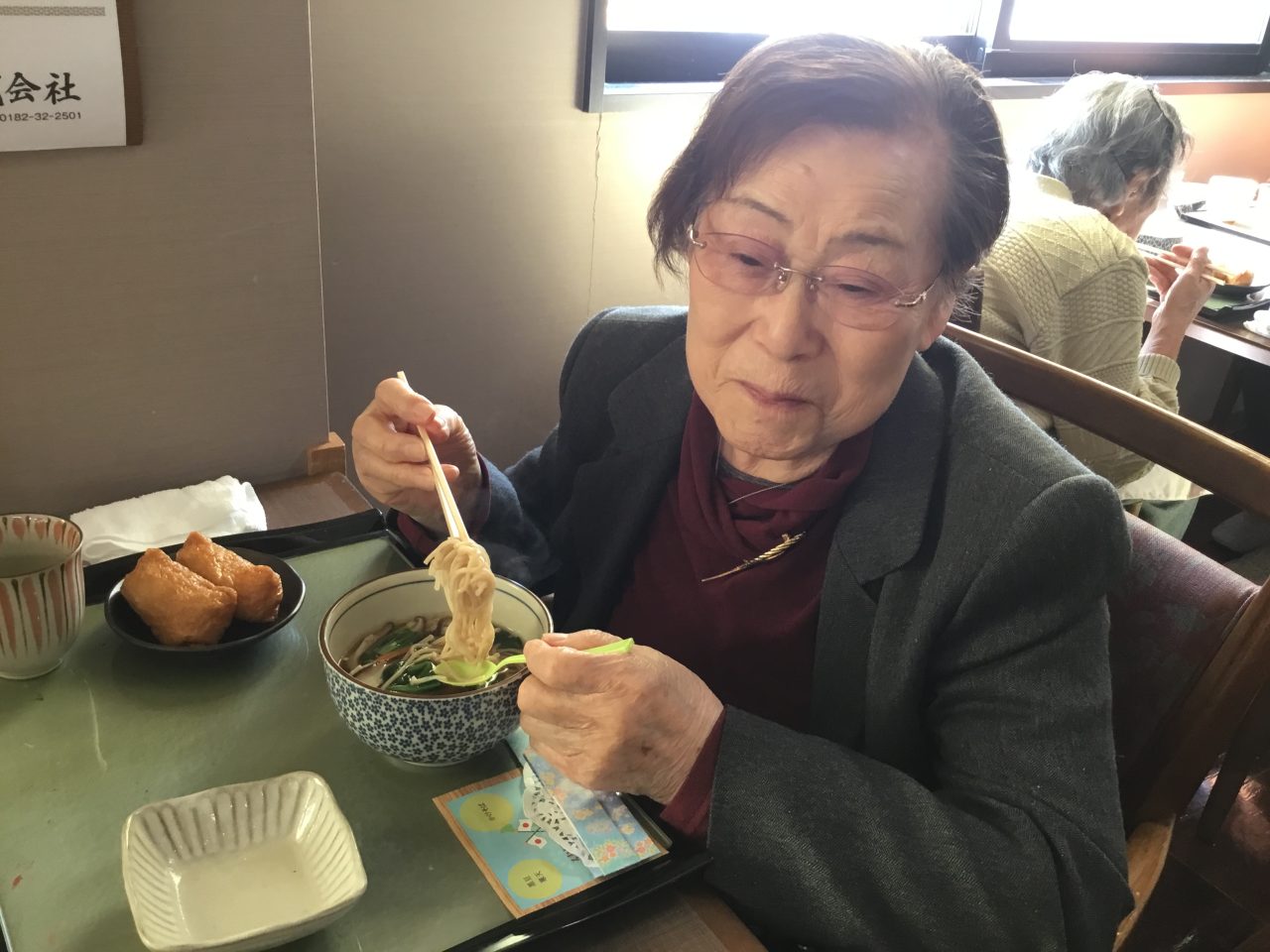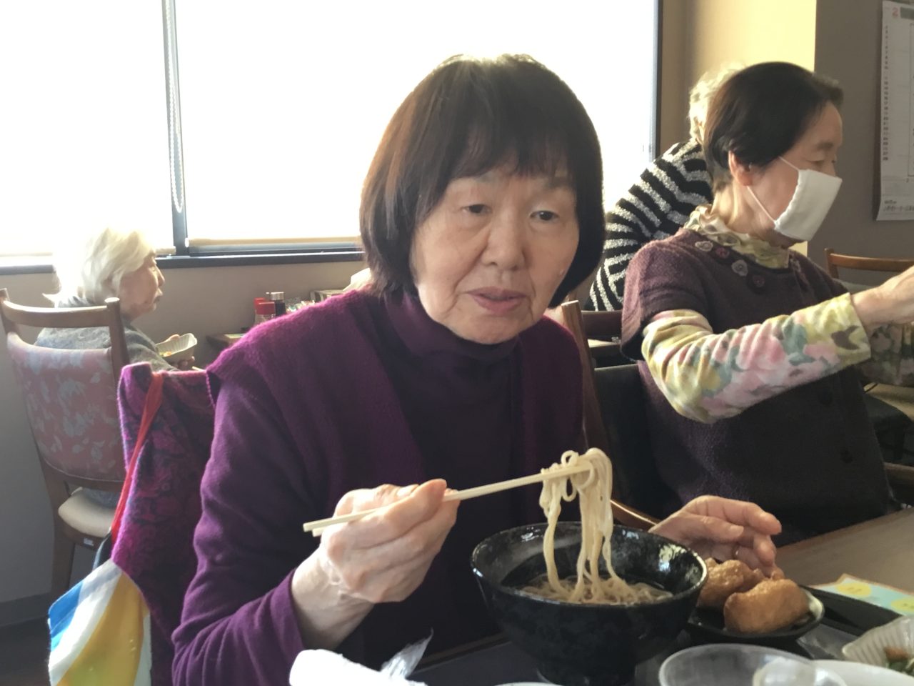 「かけ蕎麦」、「変わりお稲荷さん」、「黒豆寒天」、「ふくたちときのこの和え物」です!