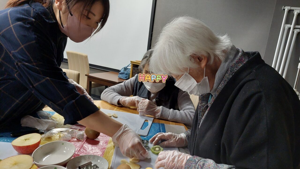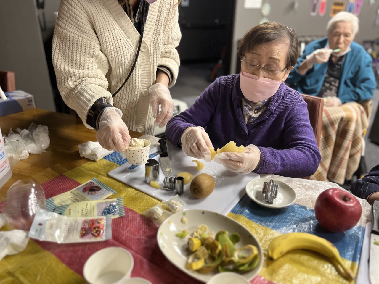 みなさんご自分のお好みのフルーツを切ったり型抜きしたりしてアイスの上に飾り付けていきます???
