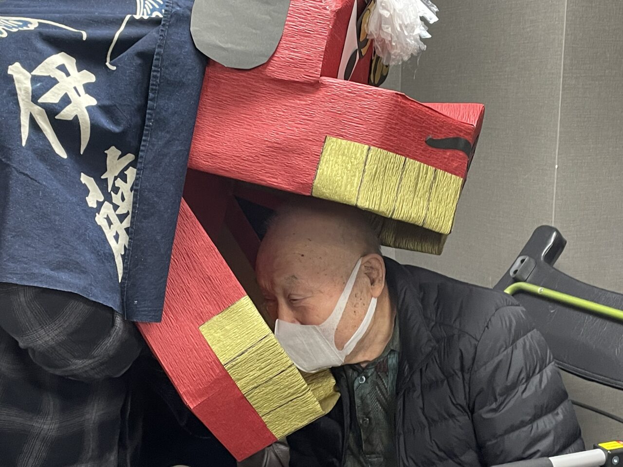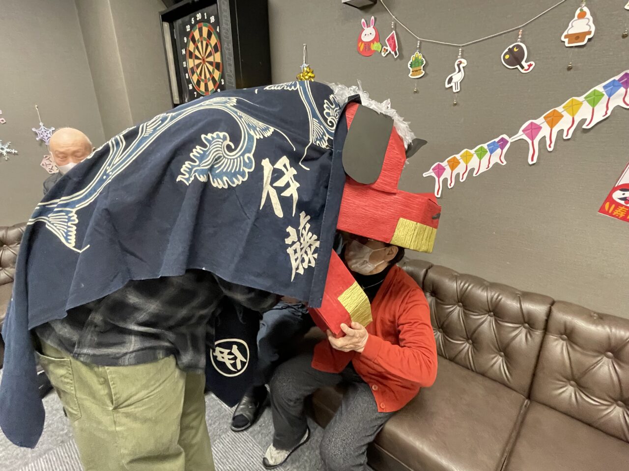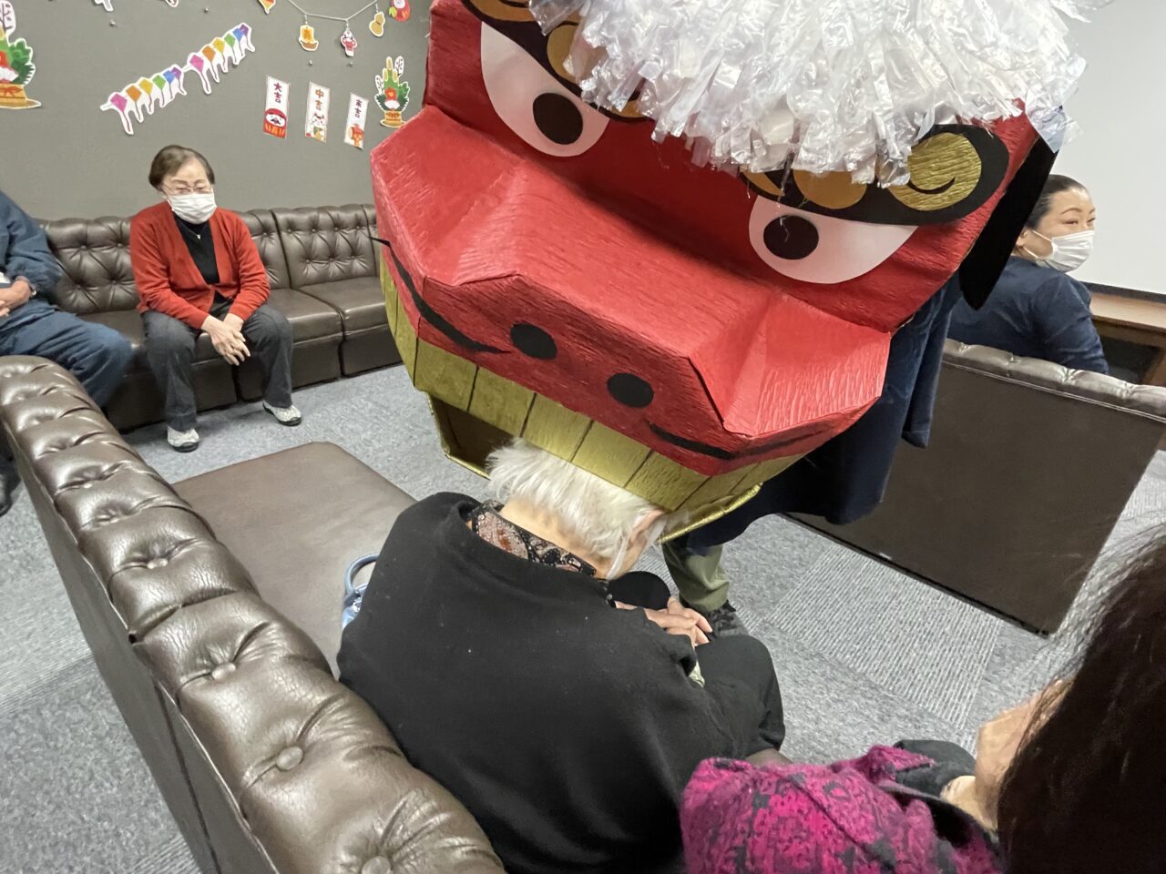 お腹も一杯になったところで午後からは毎年恒例の『獅子舞』の登場です?✨獅子舞に頭を噛んで貰うととっても縁起がいいんだそうです☺️早速噛んで貰おうとご利用者さんに集まって頂き御利益を賜りました☺️