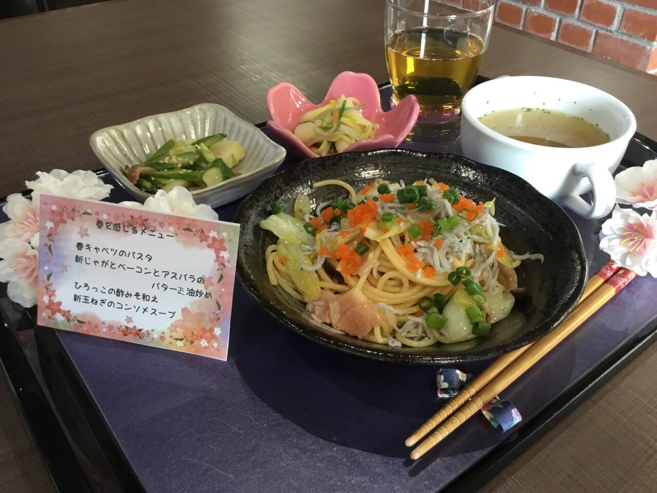 春の陽気を感じる今日この頃??本日の昼食は、すっかり好評となった職員考案メニューの日です。今月の担当は佐々木がご利用者の皆さんに?春を召し上がって頂くメニューを提供させて頂きました?