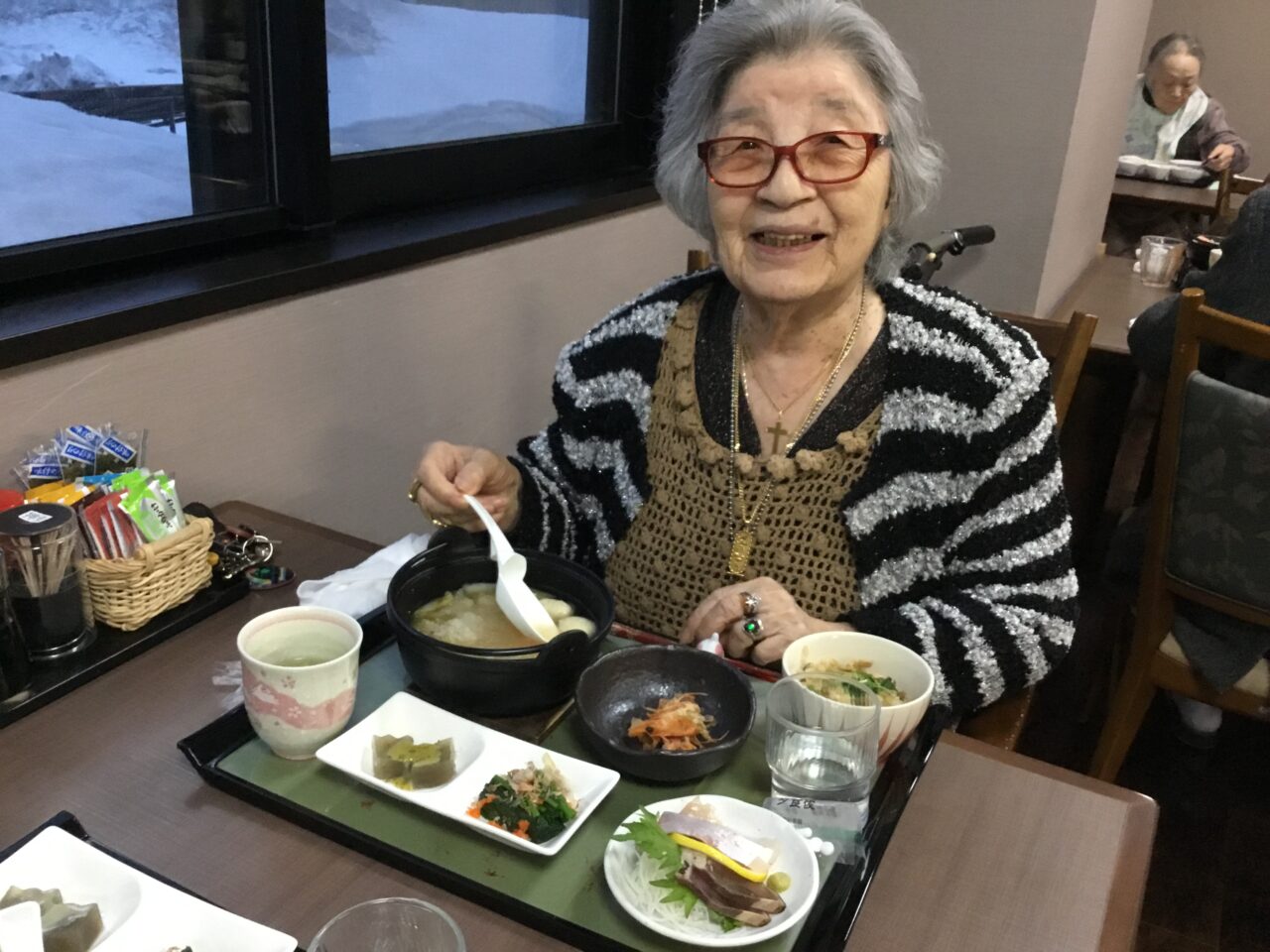 午後からはラウンジにて「甘酒」と「豆腐カステラ」をご用意させて頂き、横手の四季の映像と共に思い出話に花を咲かせておりましたよ?