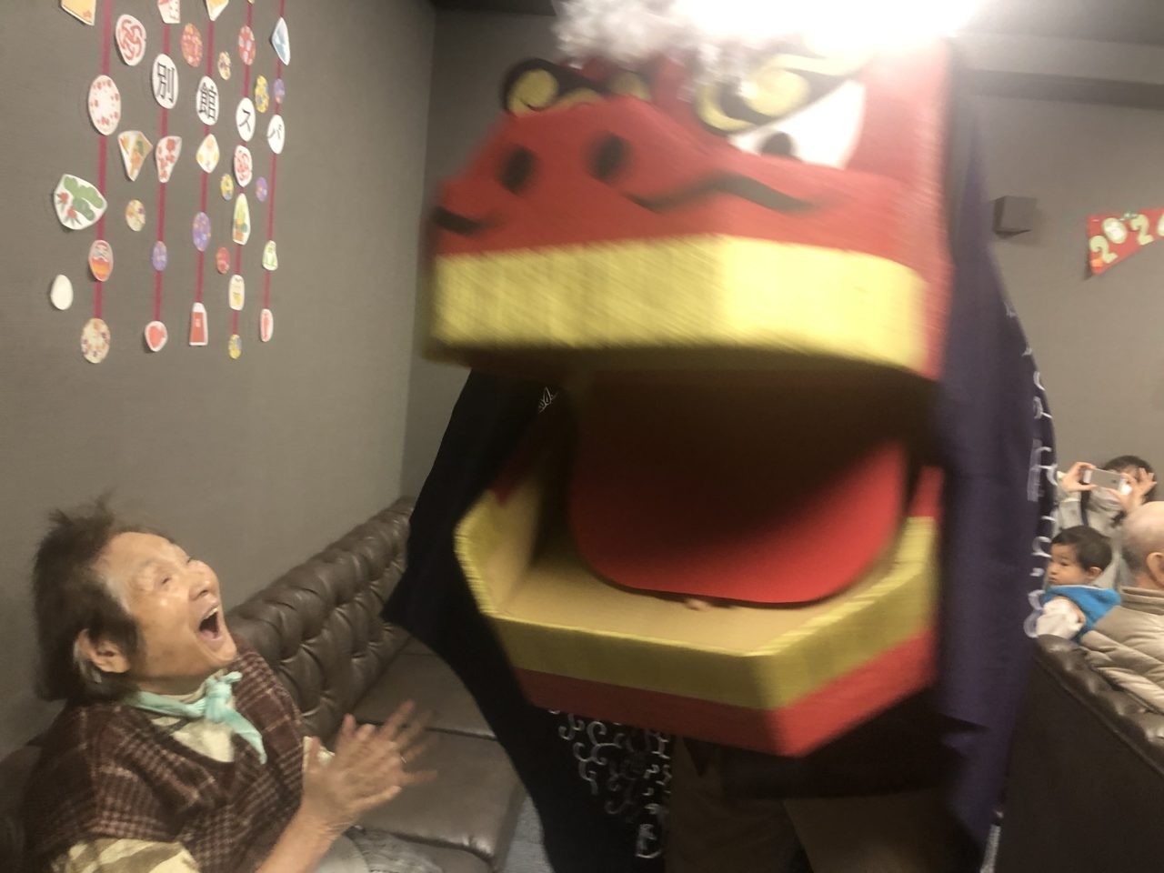 お部屋へも伺います(゚∀゚)皆さんリアルな獅子舞にびっくりされながらも、頭を噛ませて頂きました??