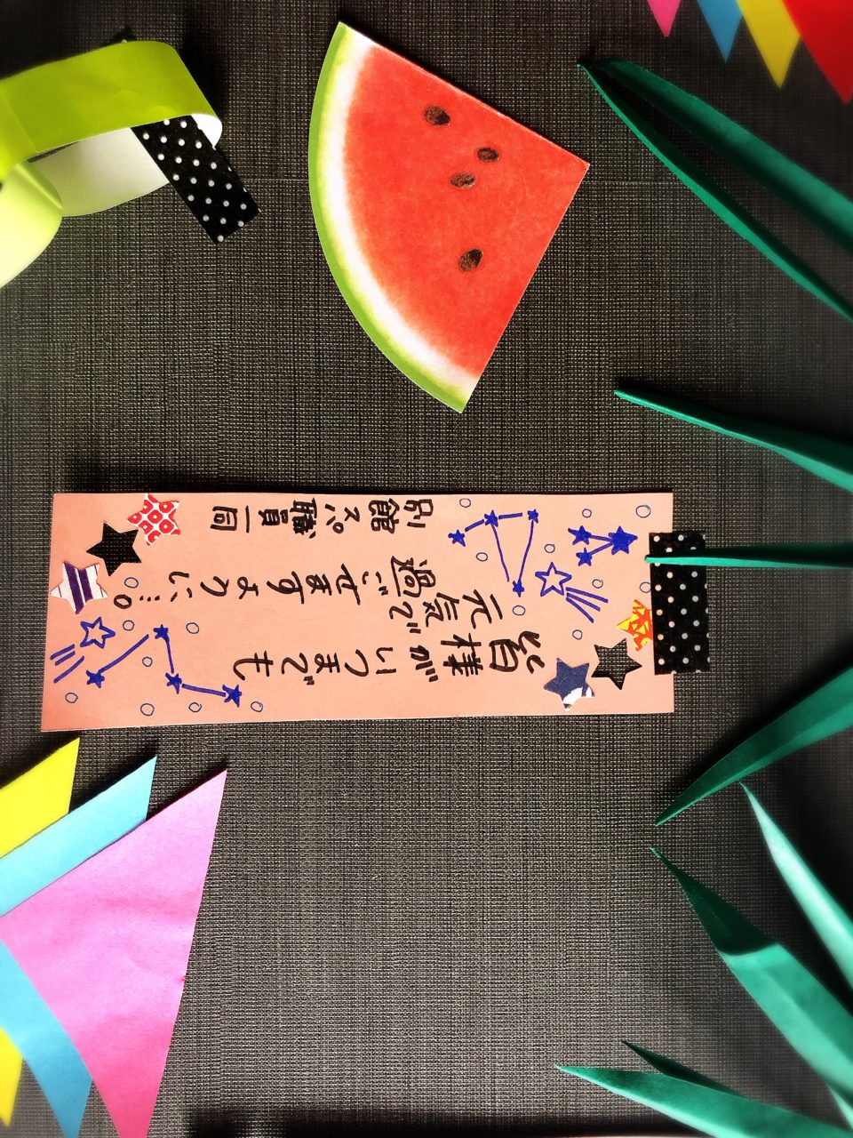 別館スパでは、今年笹の葉を使わずパートナー手作りの七夕飾りを作成しました??