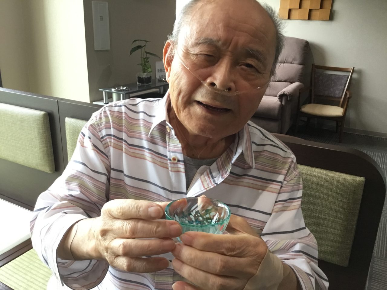 毎日晩酌されるKさんには私達職員からお猪口をプレゼント?