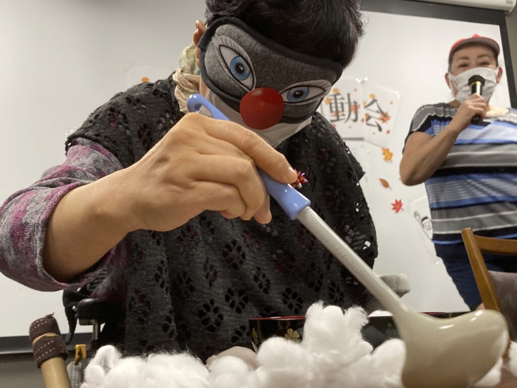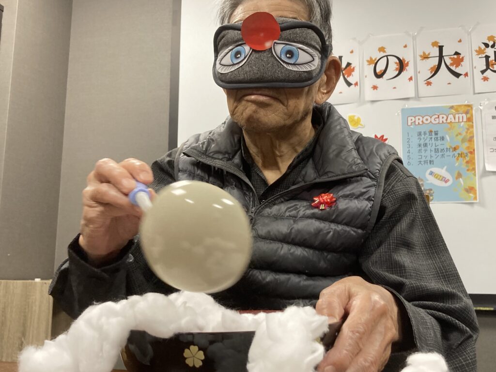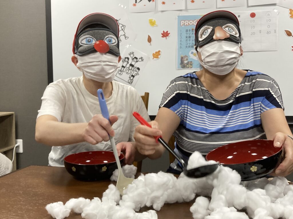 コットンをボールにして、目隠しをし、お玉ですくうという単純なゲームですが、全くすくっている感覚がないので面白いゲームとなっております?