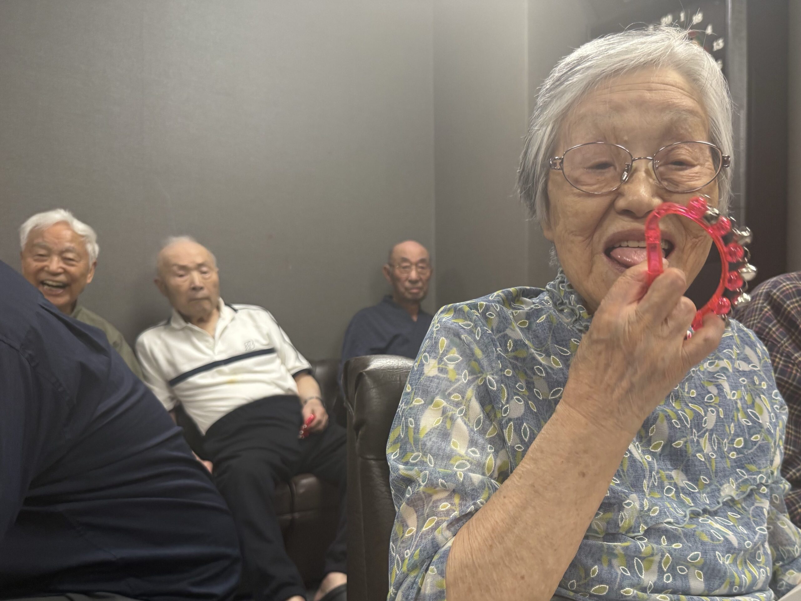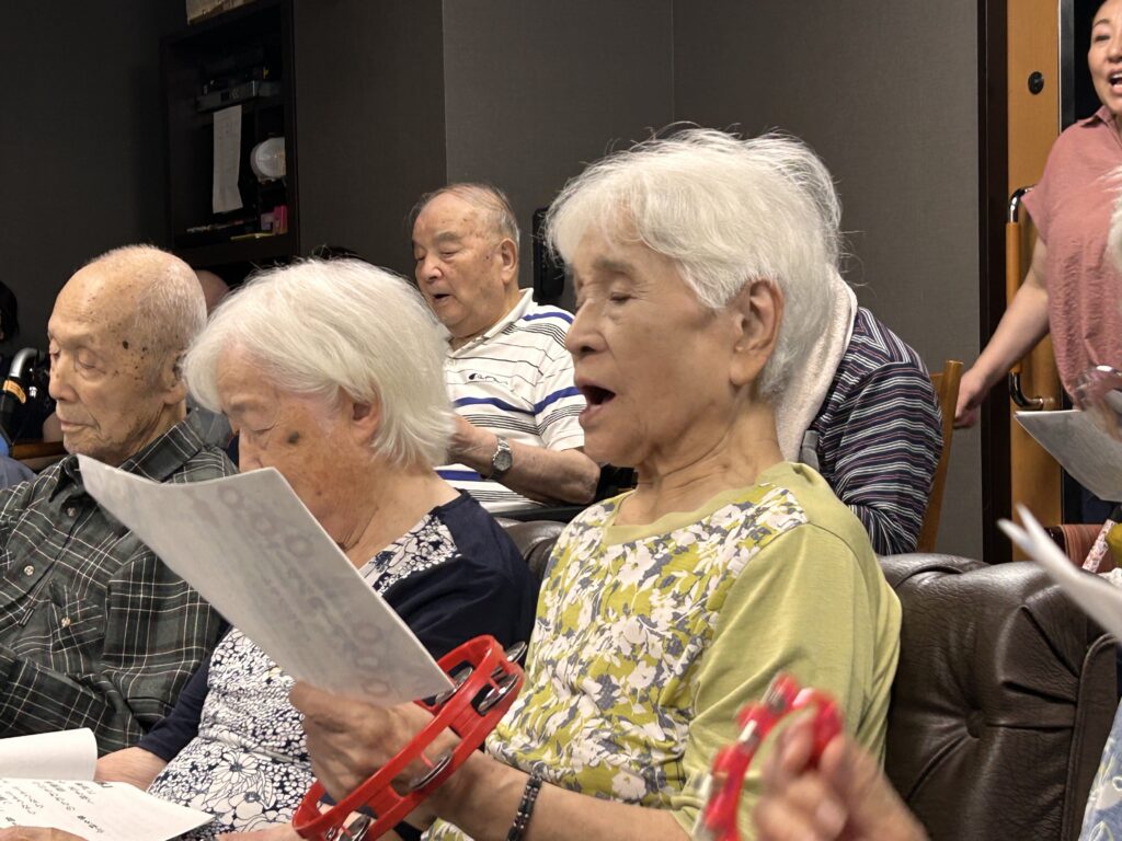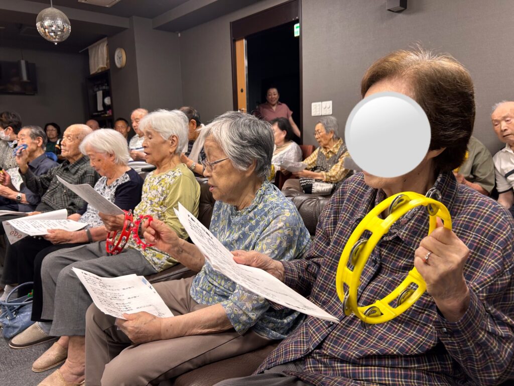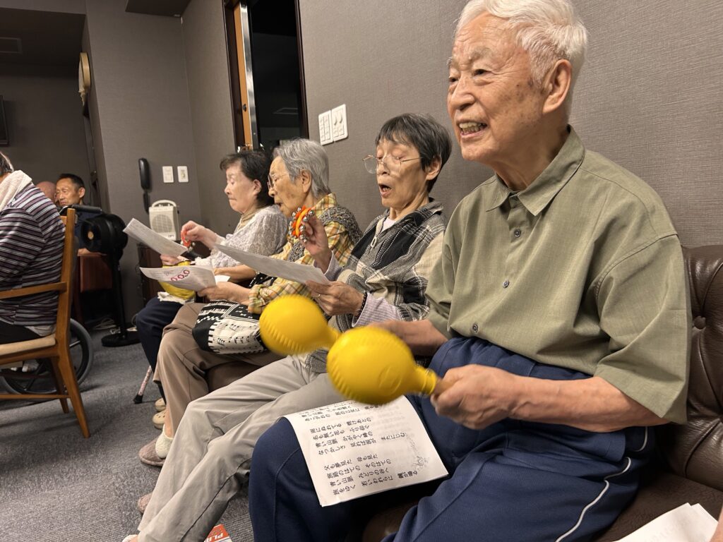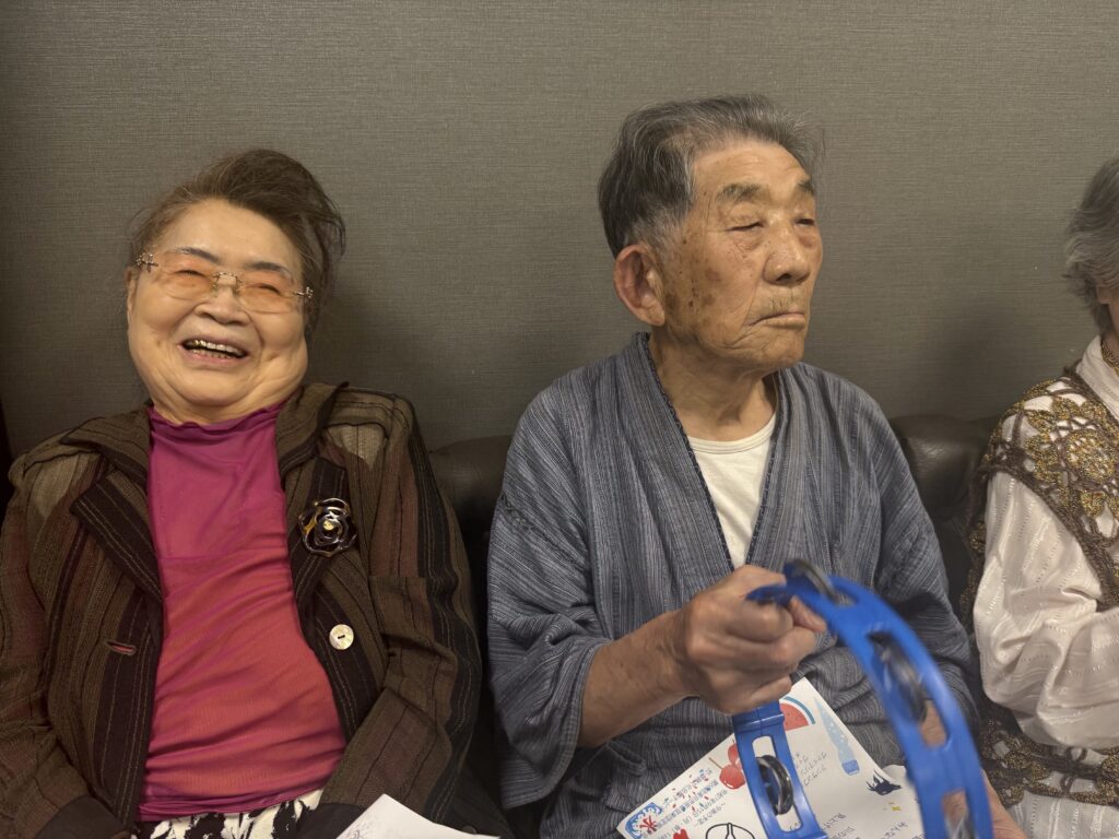 一緒に鈴やタンバリンを持ちながら、音楽を楽しむ場面も。