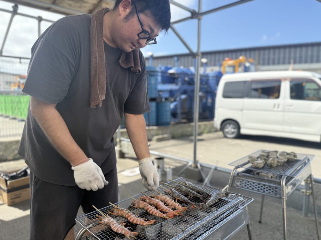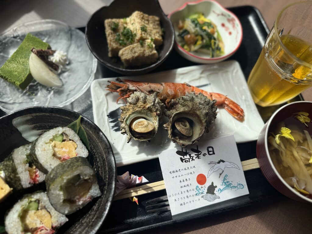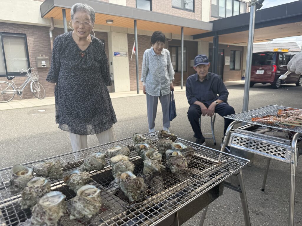 みなさんこんにちは😊さらさ別館スパです。別館では、日頃の感謝を込めて伊藤パートナーがサザエの壺焼きとエビ🦐の炭火焼きを昼食で提供させて頂きました。
