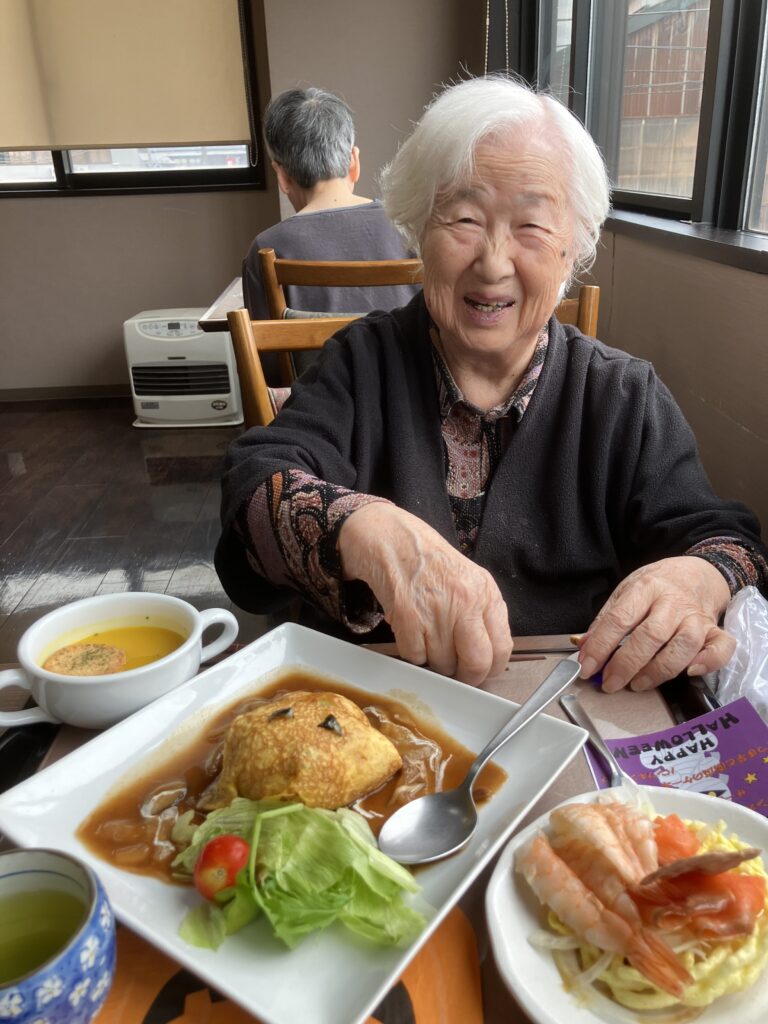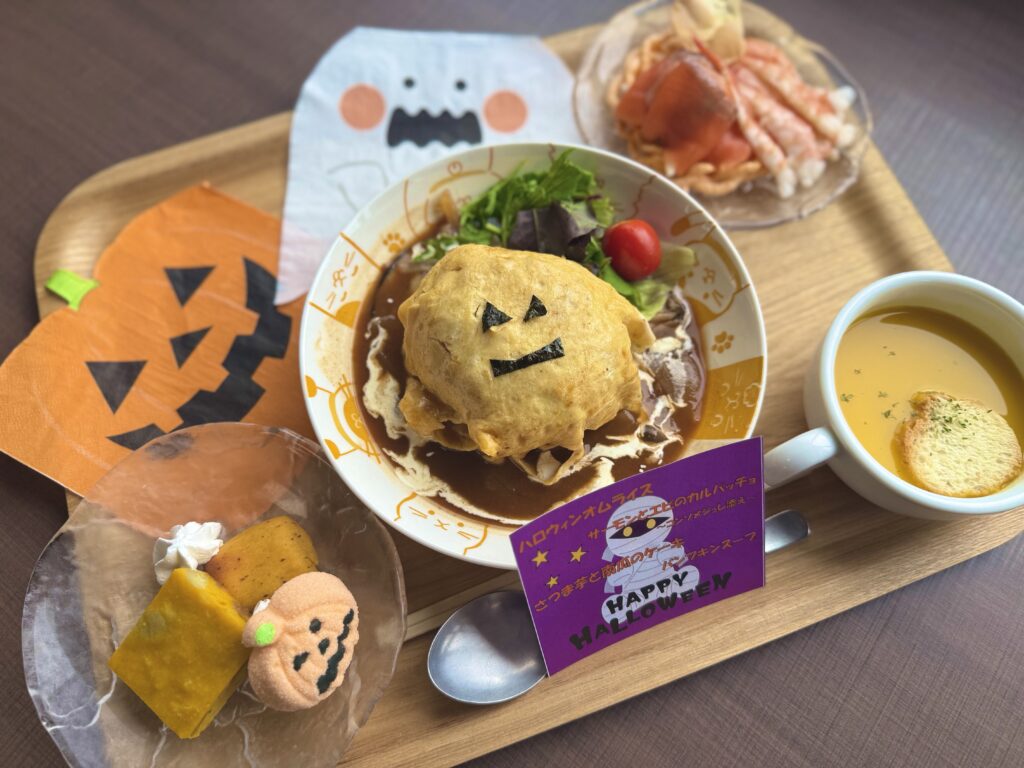 お盆からはみ出た昼食に驚きながらも、「今日は何よ、豪華だごど❣️」「あら、あら、食べきれるかしら❓」「あぁ〜美味しかった❣️」と、大満足のハロウィンメニューとなりました👍👍👍