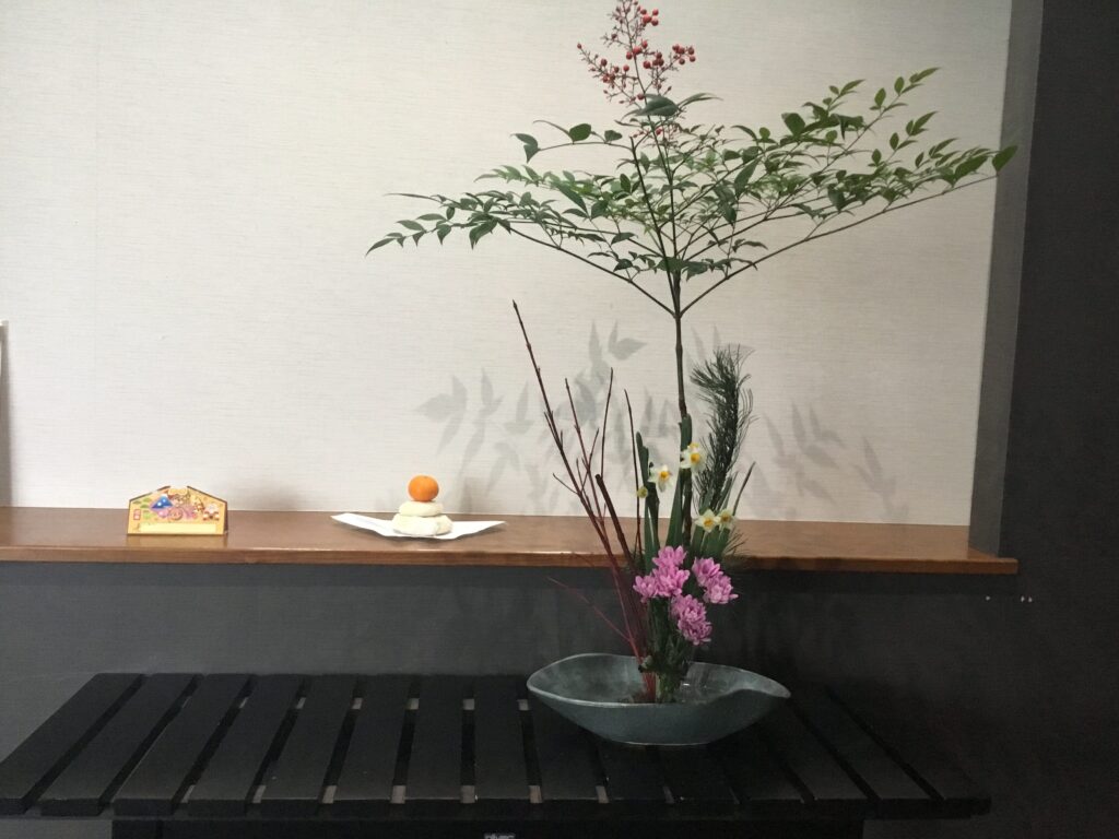 利用者さんも、昼食に降りていらっしゃり正月🎍モードのロビーに立ち止まります。