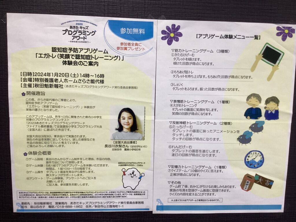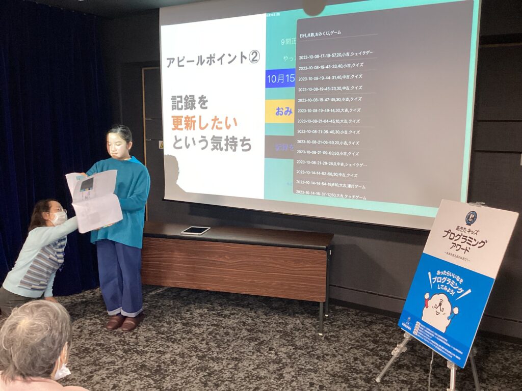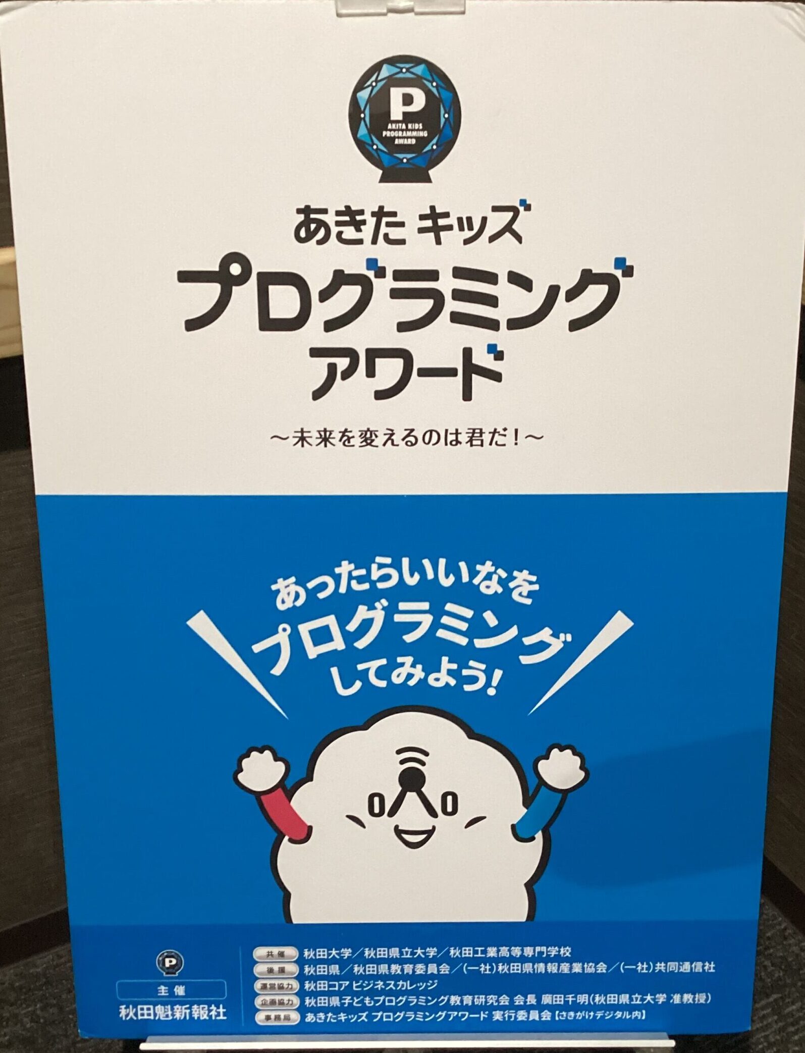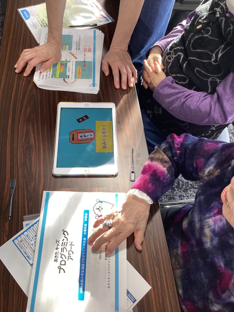 今日は、秋田魁新報社が主催する「あきたプログラミングアワード」では、毎年小学生から中学生を対象としたプログラミングコンテストを行っているそうです。今回、2023年度の全国大会に選抜された長谷川さんが作った作品をみんなで体験しました?