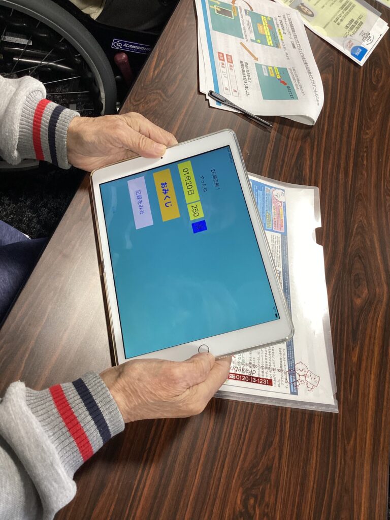 ①かたむけゲーム ②もちあげゲーム ③しぇいく ④笑顔トレーニング ⑤たっちげーむ ⑥れんだゲーム ⑦クイズゲーム の7種類のゲームをし、それぞれ点数が記録されます。
