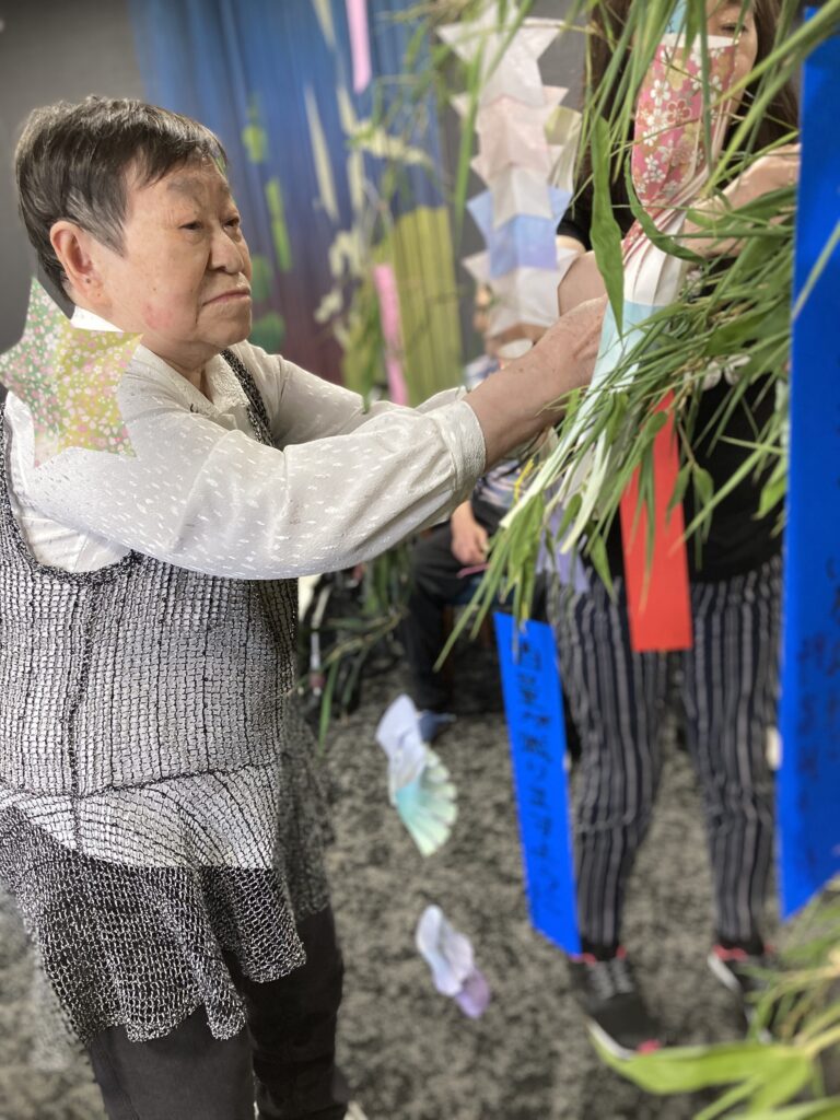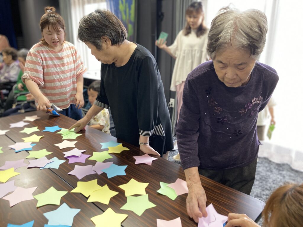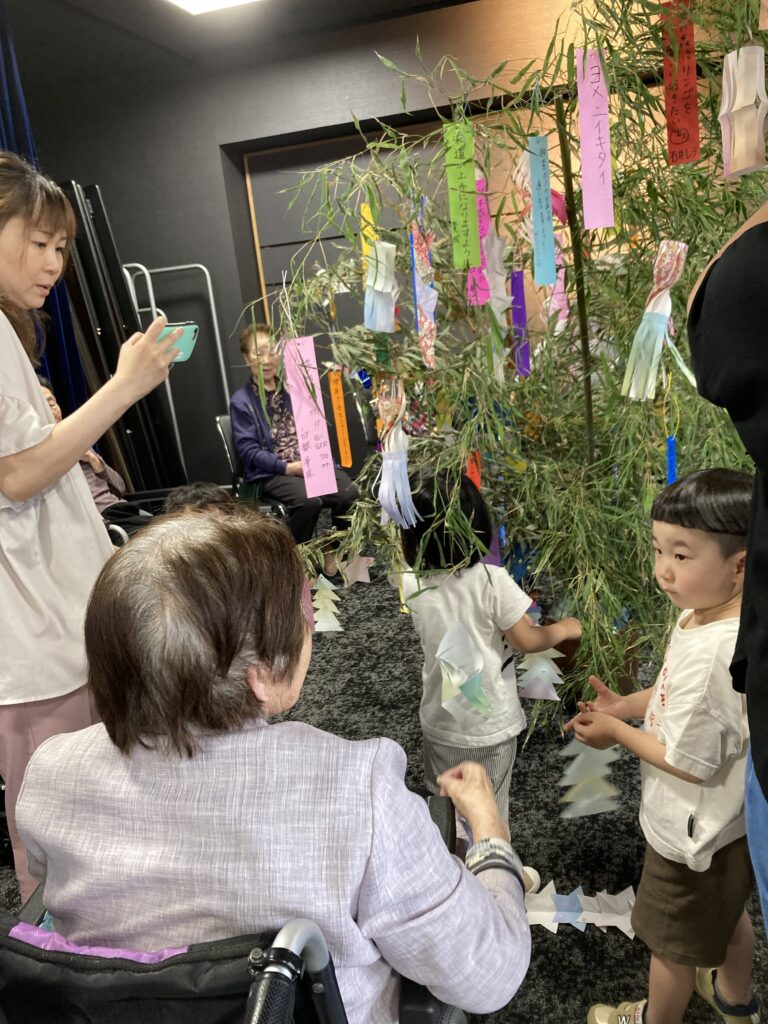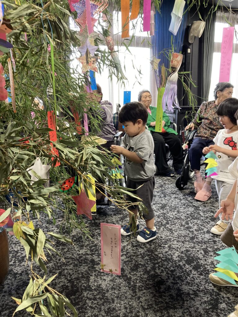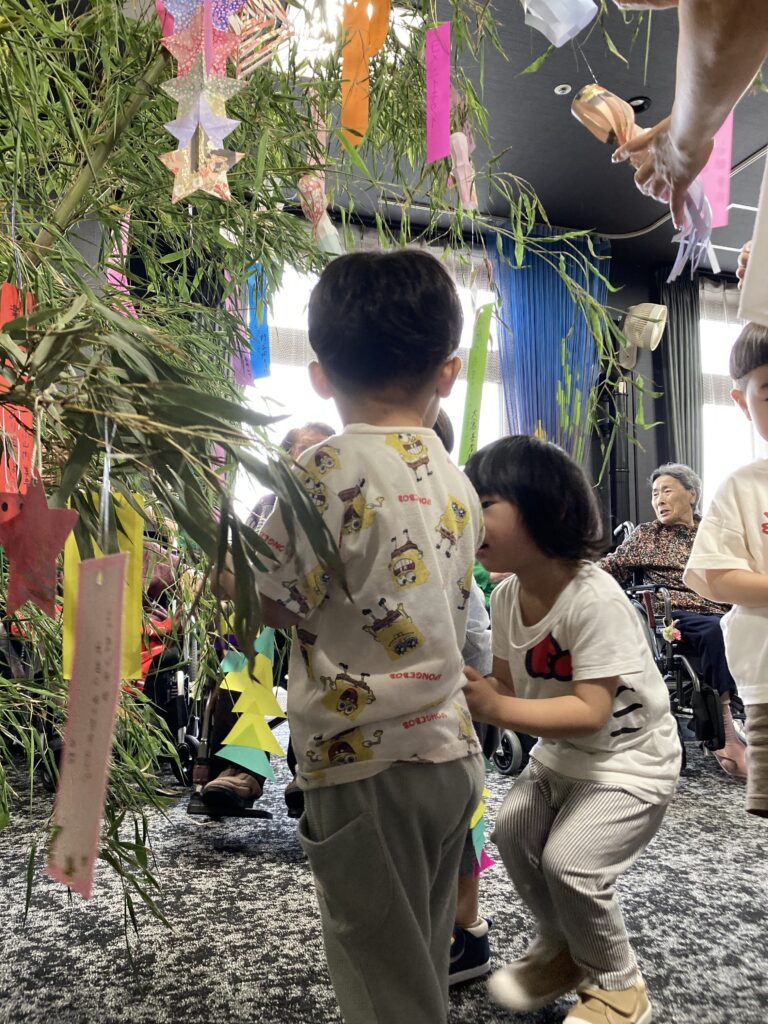 保育園の子どもたちと一緒に短冊や七夕飾りを付けました。その後、保育園の子どもたちと一緒に七夕に由来して、ちょっとしたゲームも楽しみました。参加賞で皆さんはおやつを頂いてます。
