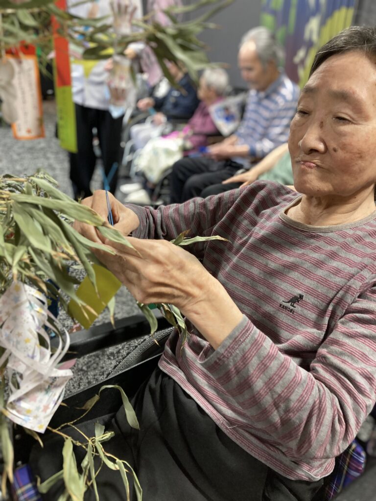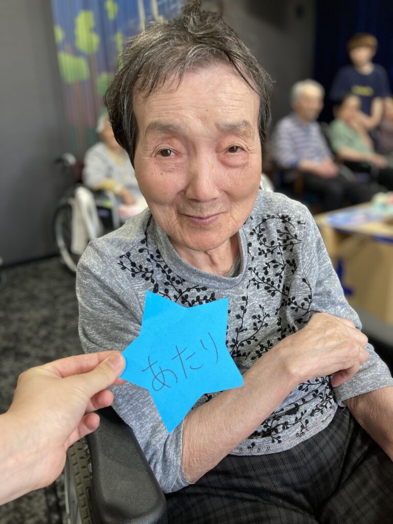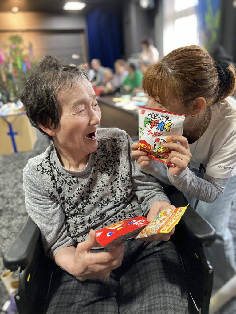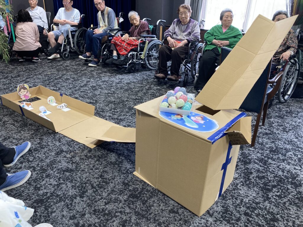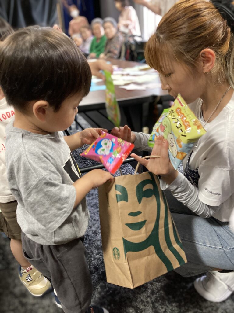 保育園の子どもたちと一緒に短冊や七夕飾りを付けました。その後、保育園の子どもたちと一緒に七夕に由来して、ちょっとしたゲームも楽しみました。参加賞で皆さんはおやつを頂いてます。