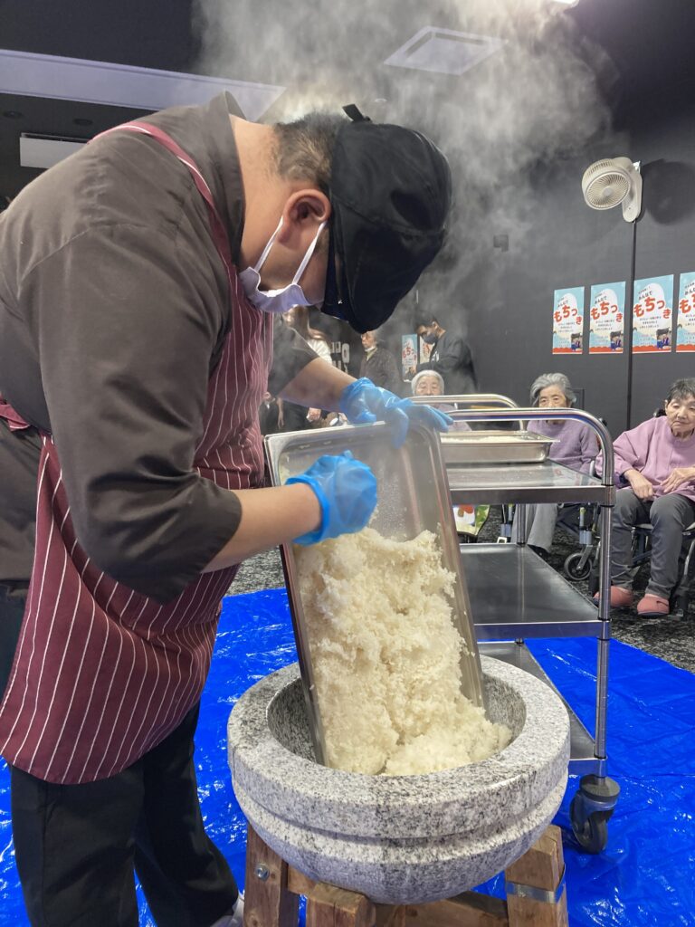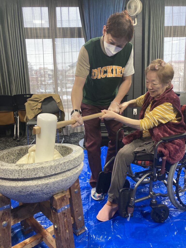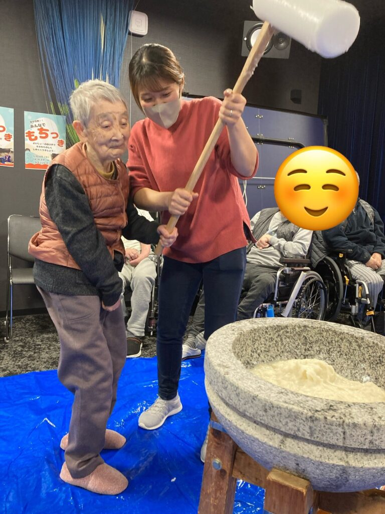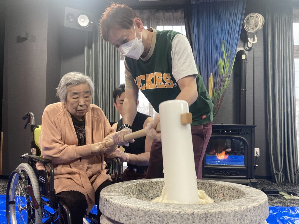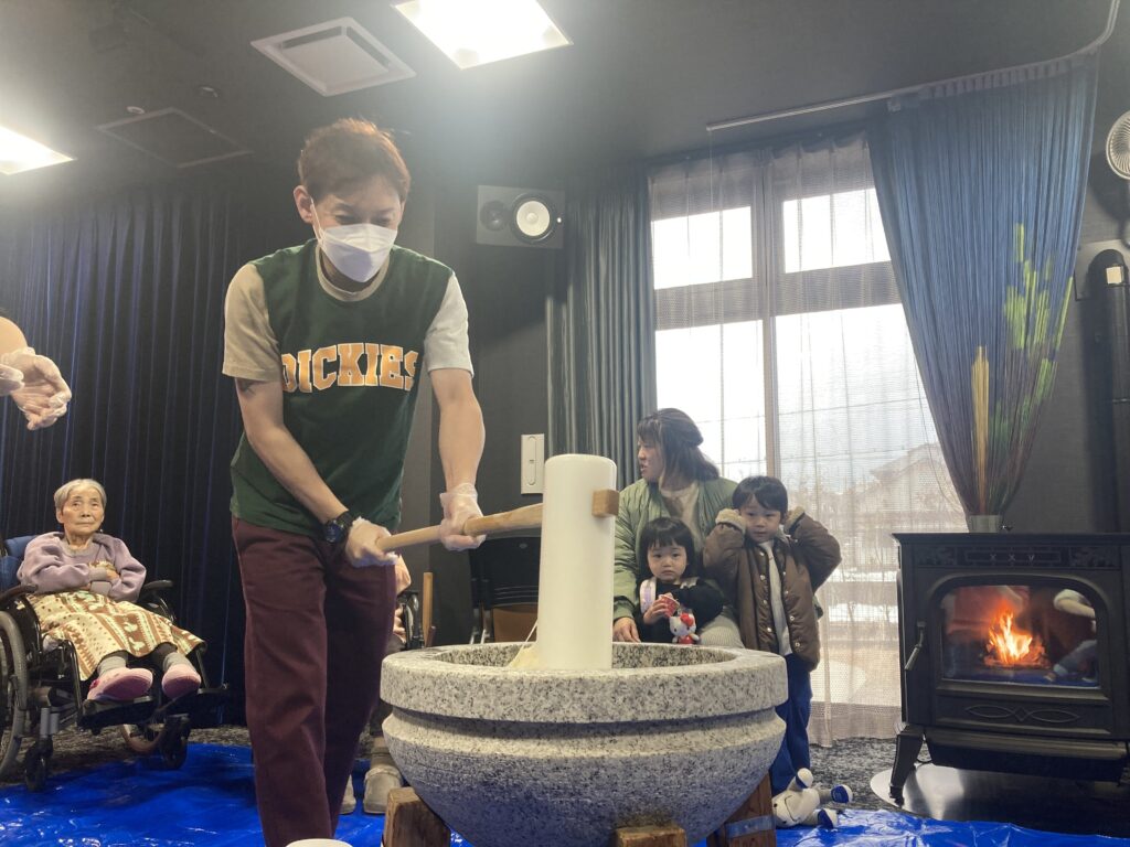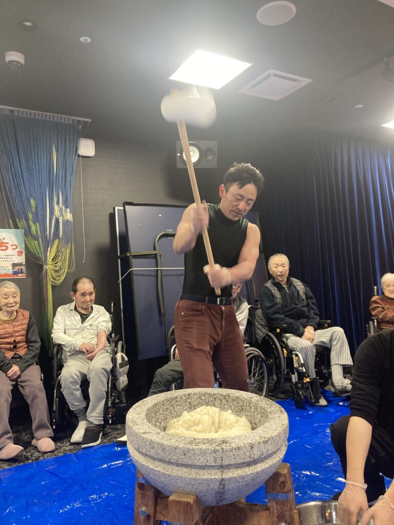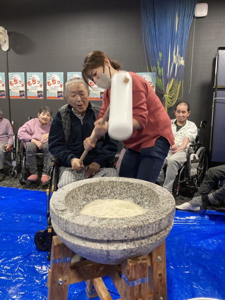 ご利用者の皆様にも餅つきにチャレンジして頂き、笑顔溢れるひとときとなりました。