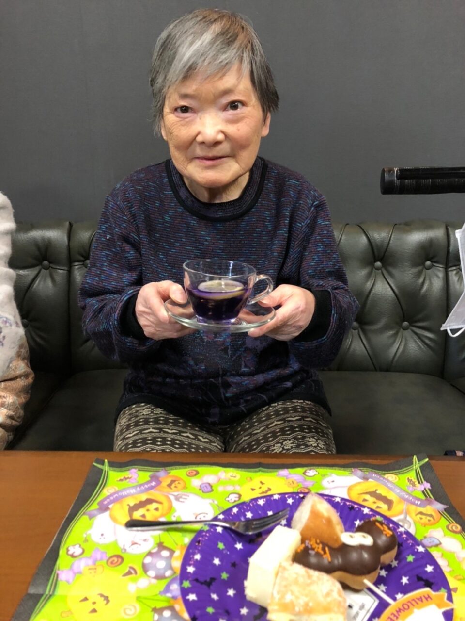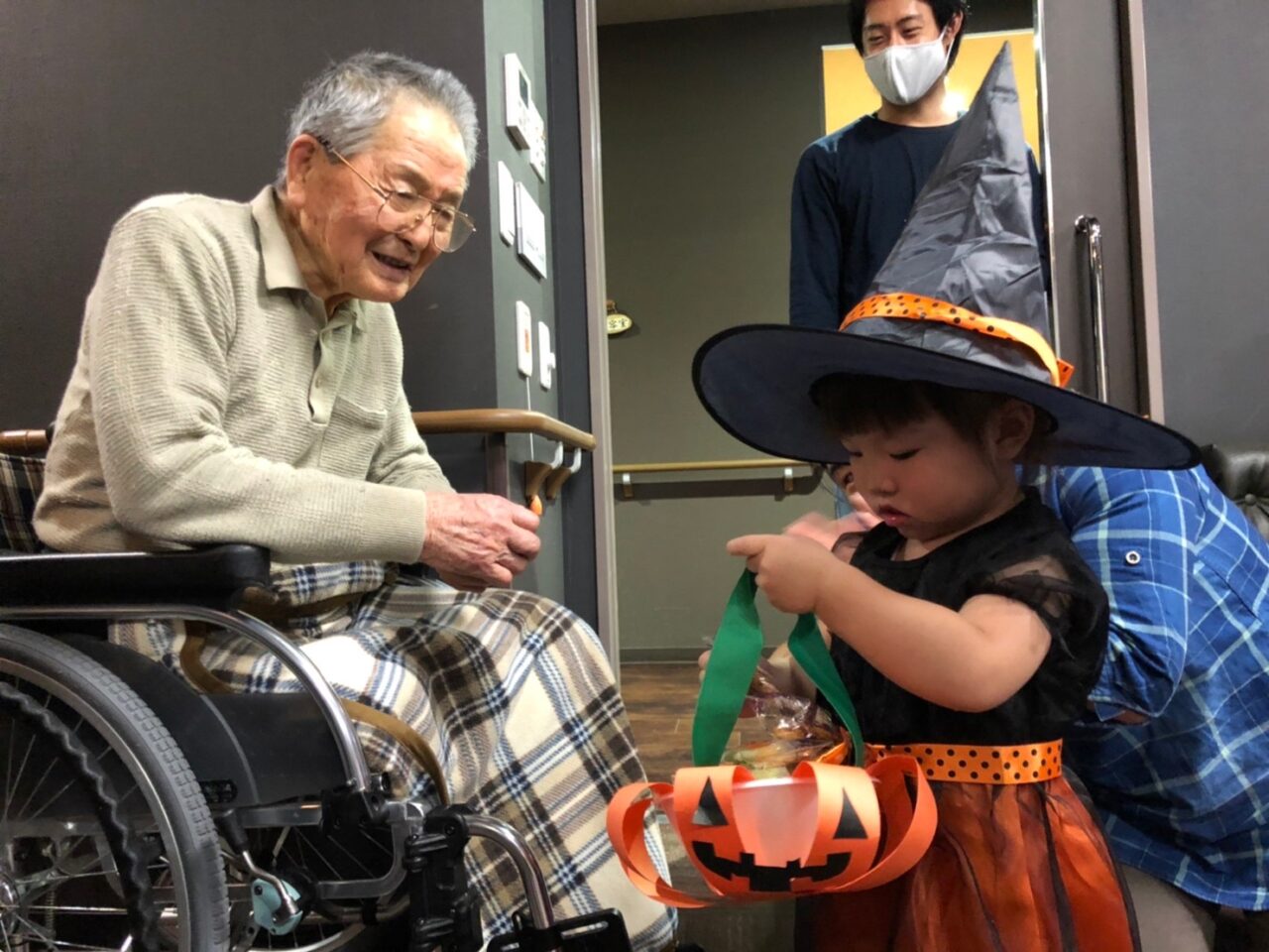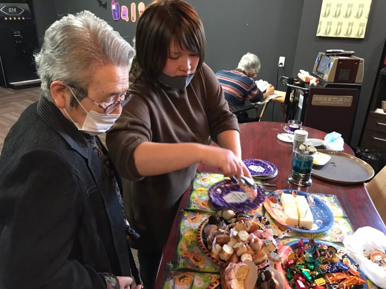 ダンスが終わり、「トリック•オア•トリート、お菓子をくれなきゃ、いたずらしちゃうぞ」の合言葉に、利用者さんからお菓子のプレゼントです?