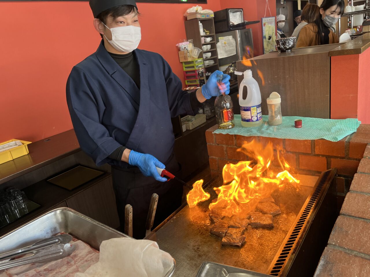 こちらはお肉を一冨士さんに焼いてもらっている写真です?