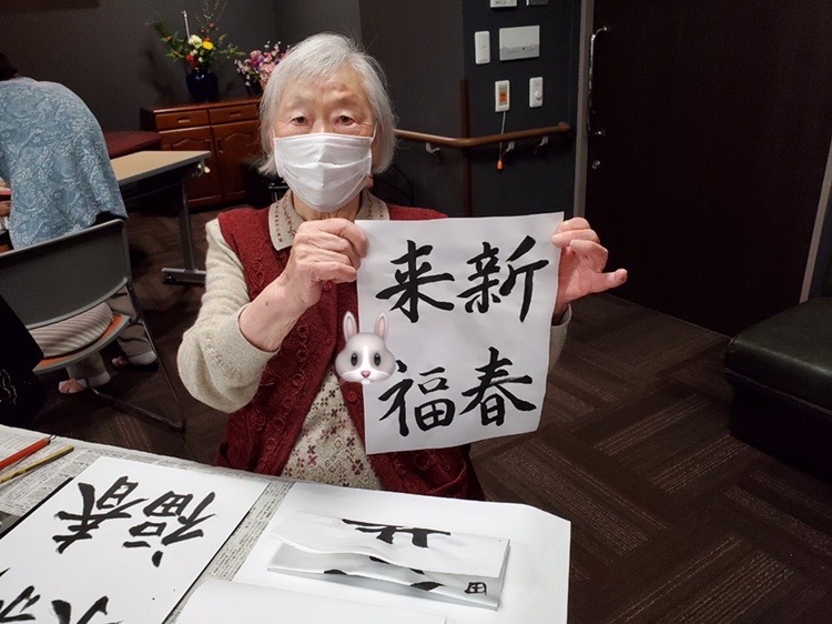 職員も書き初めに挑戦❗️年男の祐人パートナー気合いが入ってますね‼️