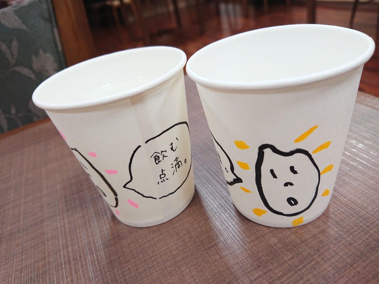 ひとつひとつ手書きのイラストとコメント入りのコップで甘酒を提供したところ、「あんたは何て書いてある?」など、楽しそうに話題に挙げて下さり、お喜びのご様子でした?