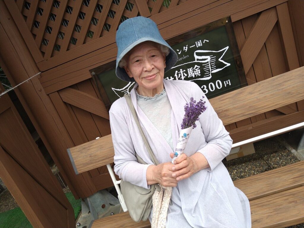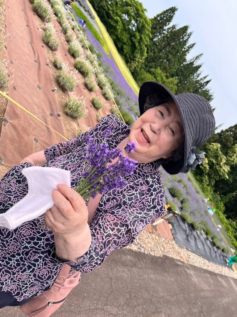 綺麗なラベンダーを手に「いい香りー」「やっぱりこの匂いやすらぐなー」と