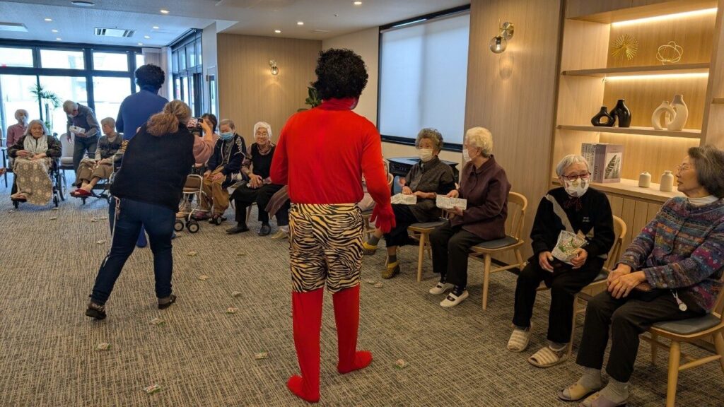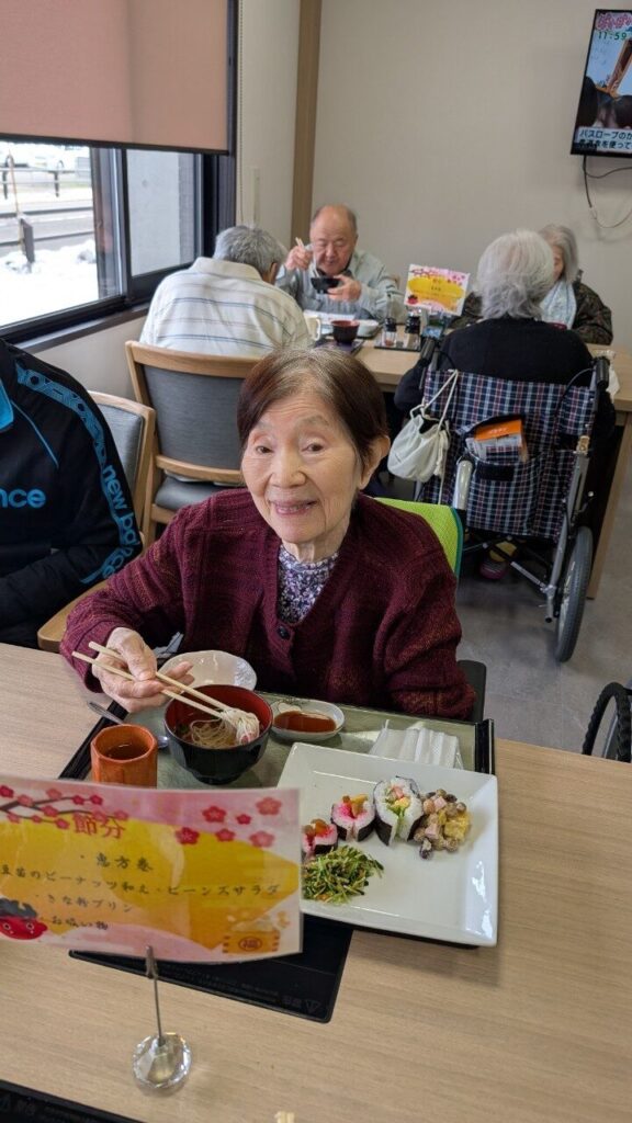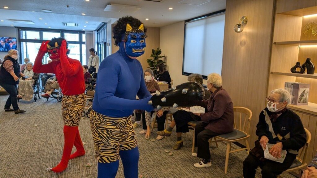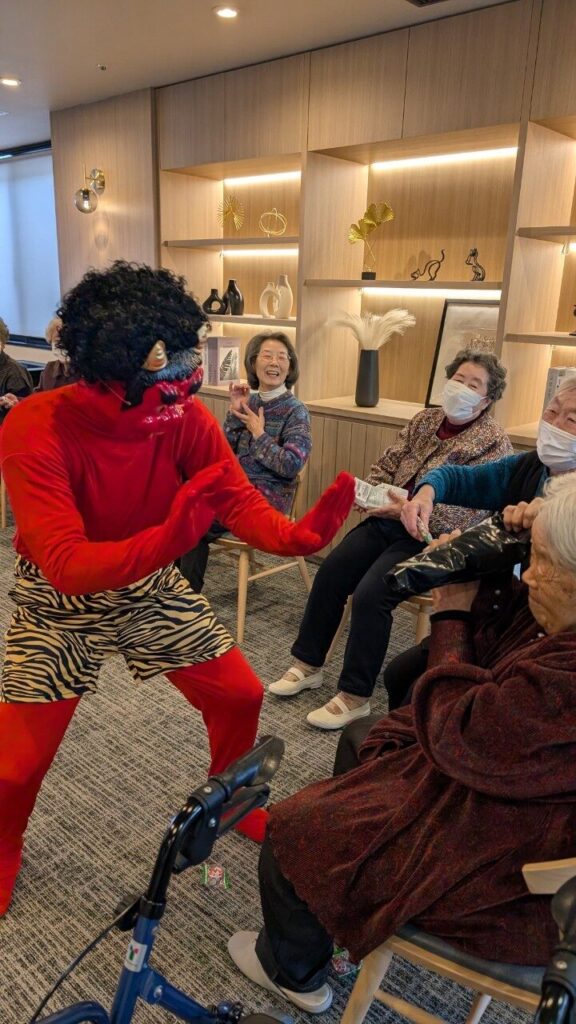 豆をたくさんぶつけられたり、金棒を奪われ反撃されたり、「鬼は外福は内」を掛け声に子供達、利用者皆さんで鬼を退治しました。みんな強すぎるぜ‼️今年も無事に鬼退治成功‼️