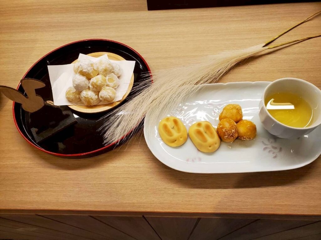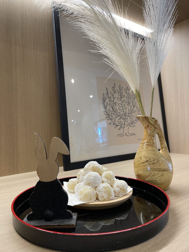 お茶会のお菓子は手作りの団子🍡とうさぎの形をしたお菓子を信州よりお取り寄せしました🎁