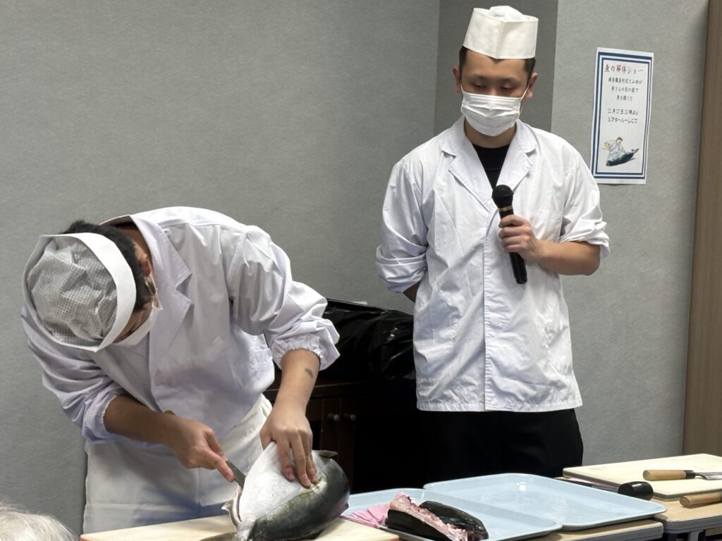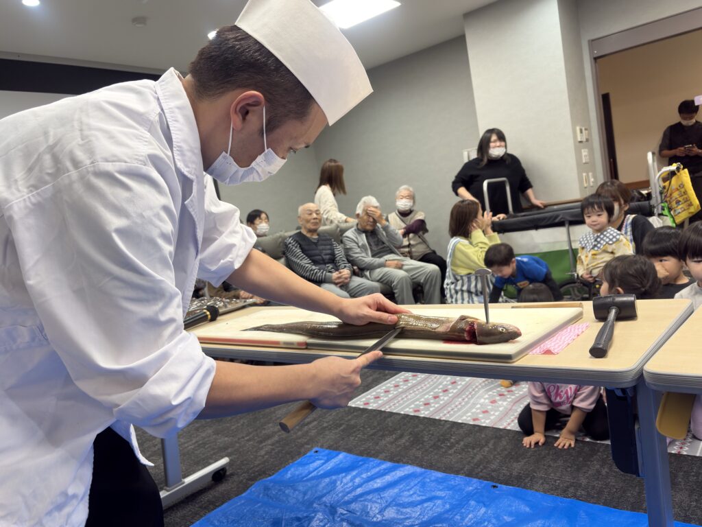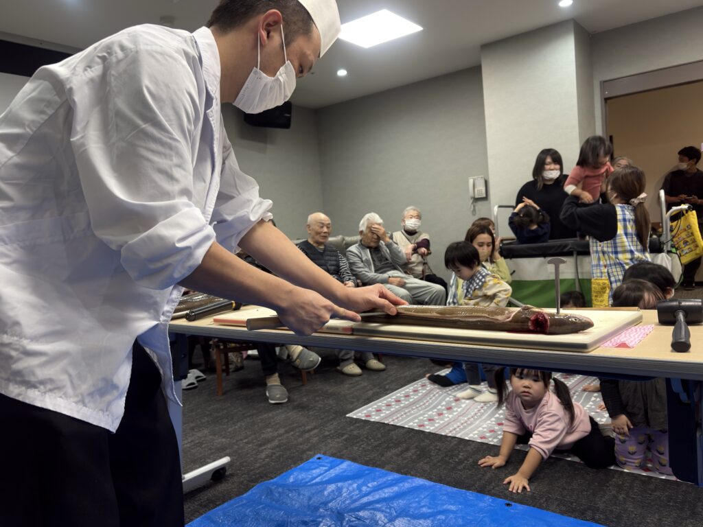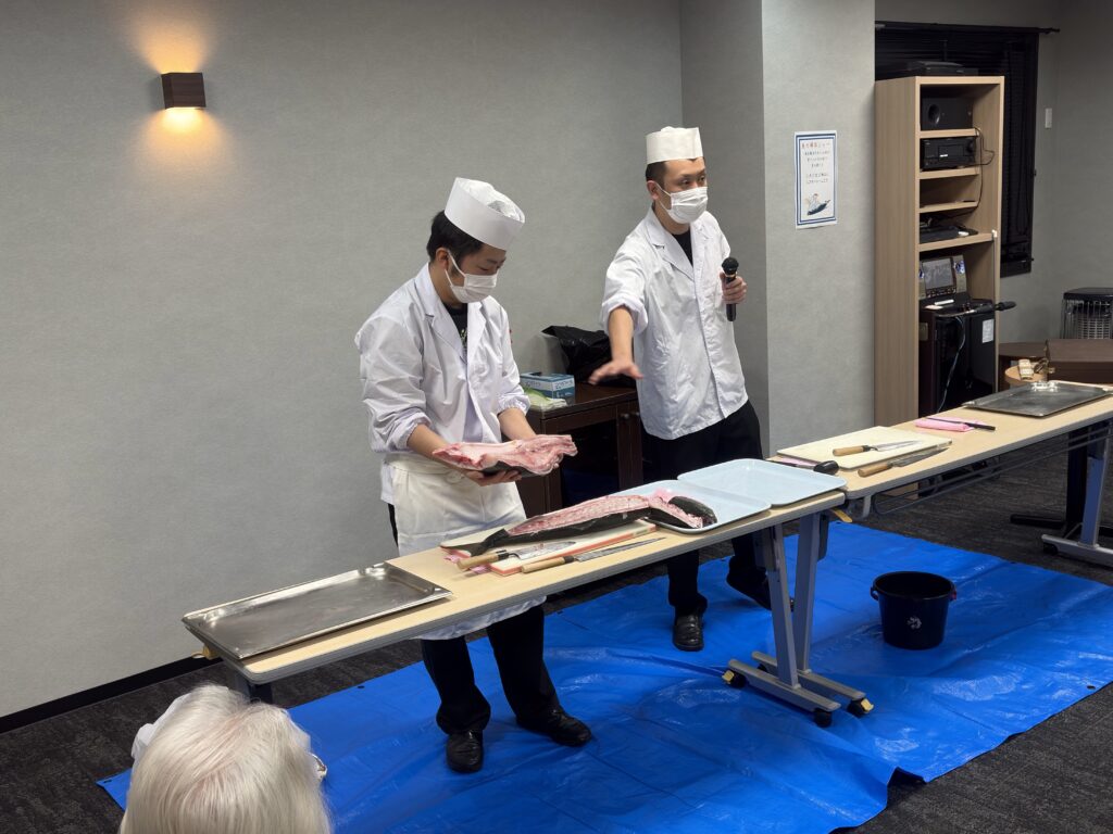 利用者の皆さんの真近で捌いているところを見ていただきました