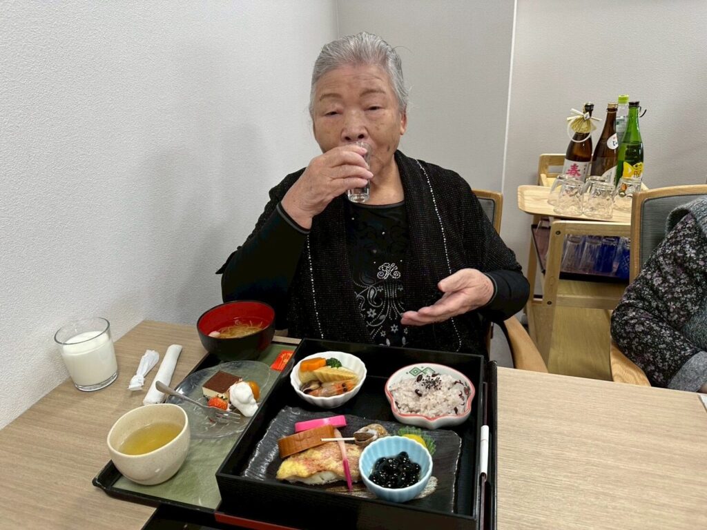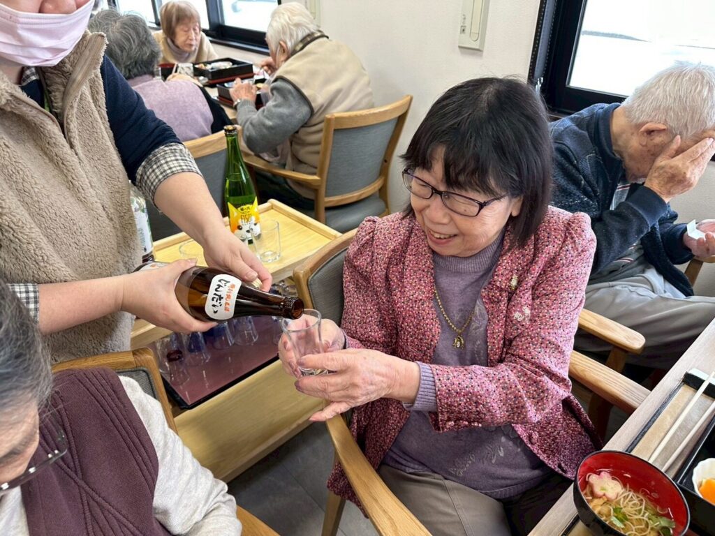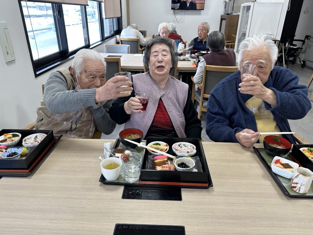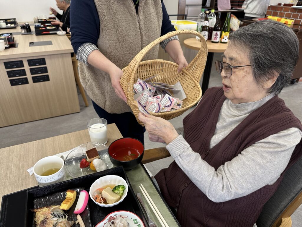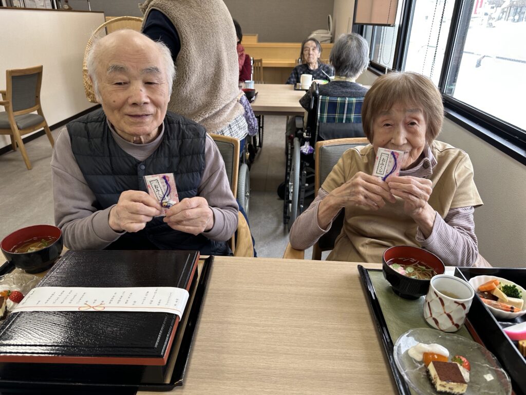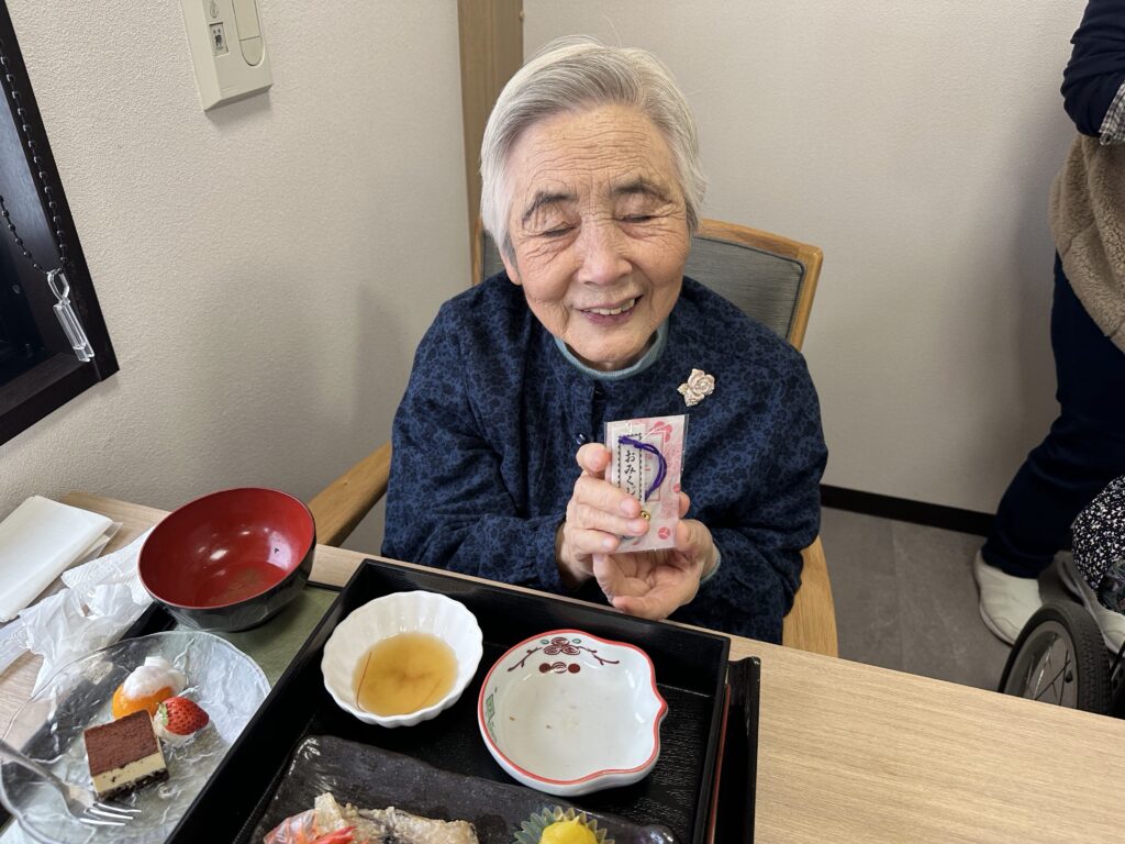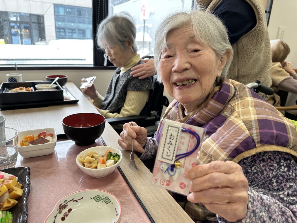 普段お酒を飲まないご利用者さんも「せっかくだから今日は飲もうかな?」と他の方と乾杯をされたり、「あら、私大吉が出たわよ❤️」など、笑顔の絶えない昼食となりました😊